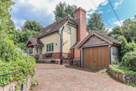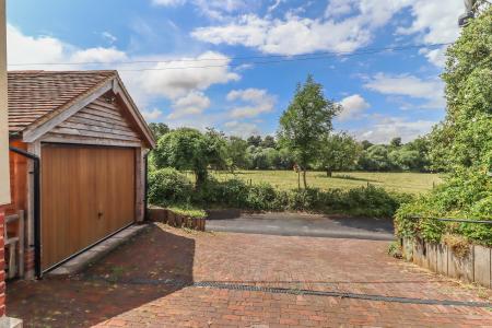 Wide splayed entrance off village lane. Attractive substantial block paved driveway leads to garage and round to the front of the house providing ample parking. Sleeper edged raised border with variety of flowers, shrubs and holly tree. Access to front entrance porch and garage. Log storage with raised paved area to rear of driveway, shrub border and sleeper edged curved steps leading up to a picket gate into the rear garden. Outside tap. Contemporary outside lighting. Attractive views are enjoyed toward water meadows and across the valley.
