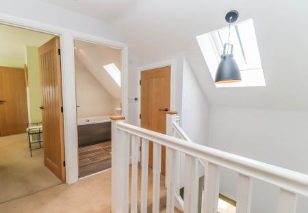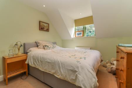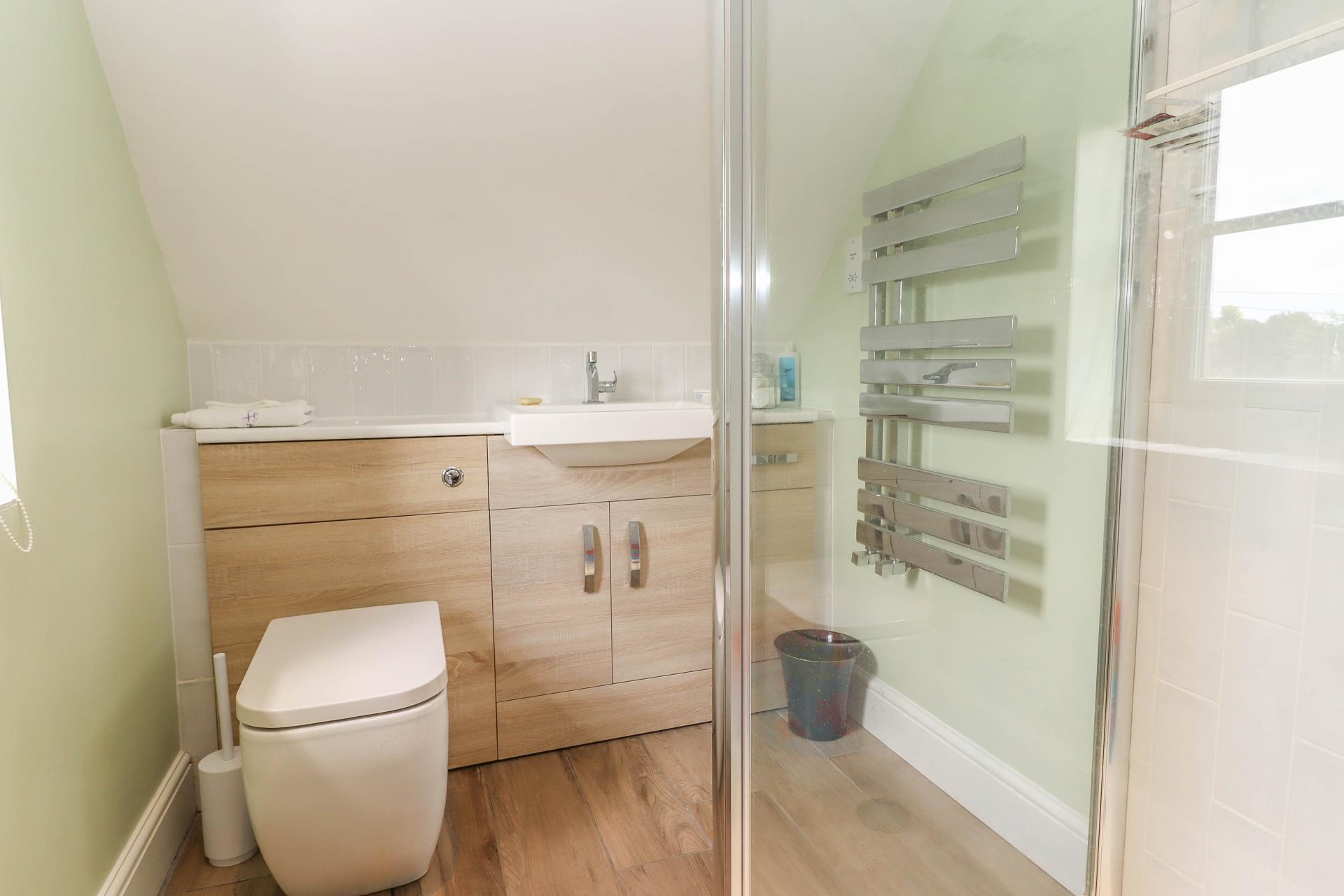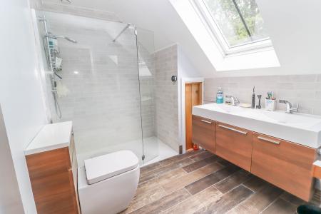 EN SUITE SHOWER ROOM White suite comprising contemporary twin wash hand basins with mixer taps, drawer/cupboard beneath. Low level WC with concealed cistern. Opening to side of frameless glass screen into wet area with metro tiled surround and power shower with external control. LED down lighters. Extractor fan. Velux window to rear aspect with view towards farmland. Contemporary radiator with mirror. Access into eaves storage cupboard with oak effect ceramic tiled flooring. Further storage cupboard with skilling ceiling housing wall hung mains gas fired boiler and pressurised hot water cylinder with expansion tanks.