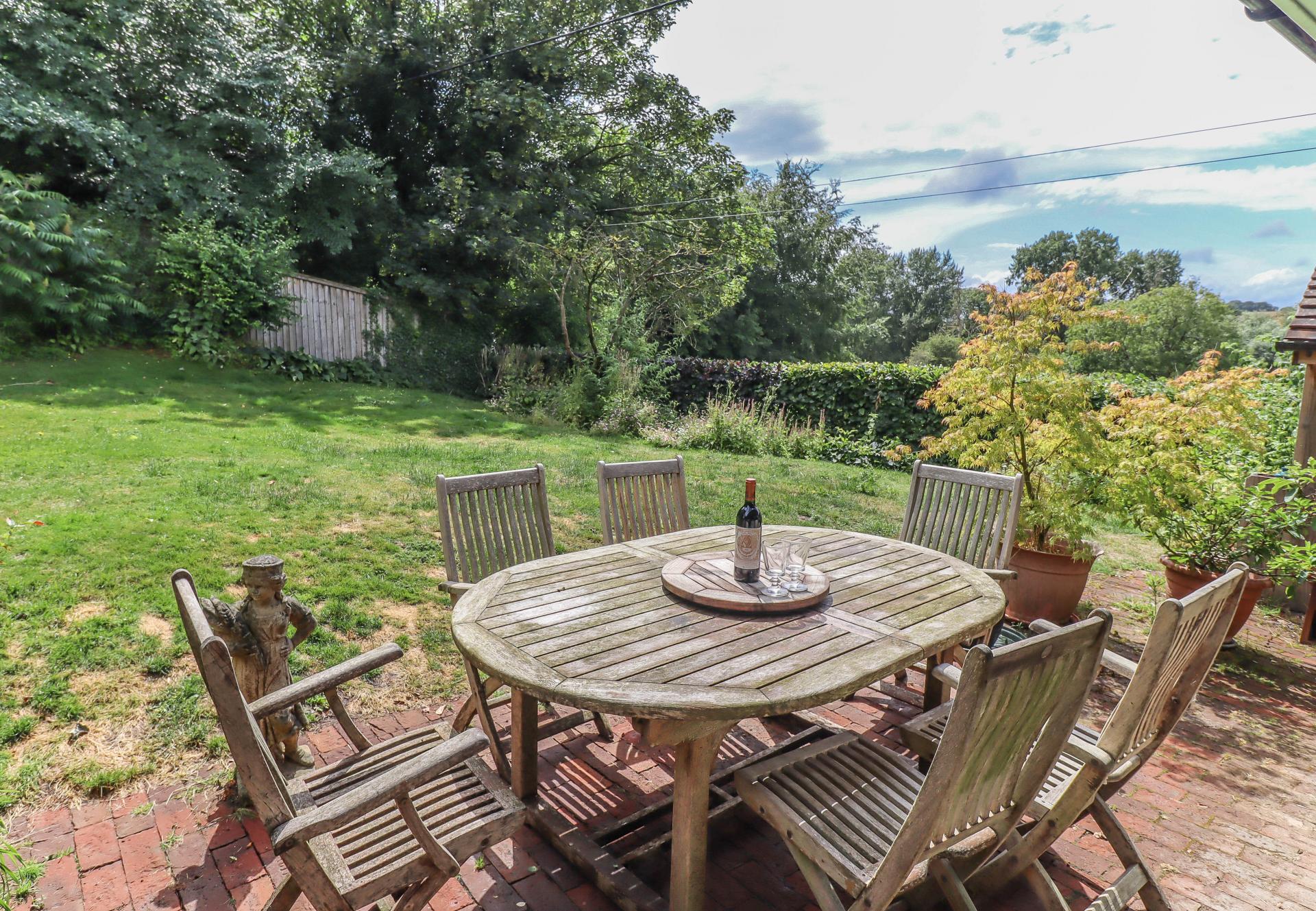 REAR GARDEN Featuring a wide block paved terrace, partly beneath a veranda along the rear elevations with inset LED down lighters. Feature paved seat with sleepers. Curved Flemish bond brick retaining wall. Gently sloping lawn with attractive mature herbaceous borders. The side boundary is screened by feather edge fencing with low mixed hedging enclosing the front boundary affording a glorious open view over the valley. Sandstone steps rise beneath apple tree to: