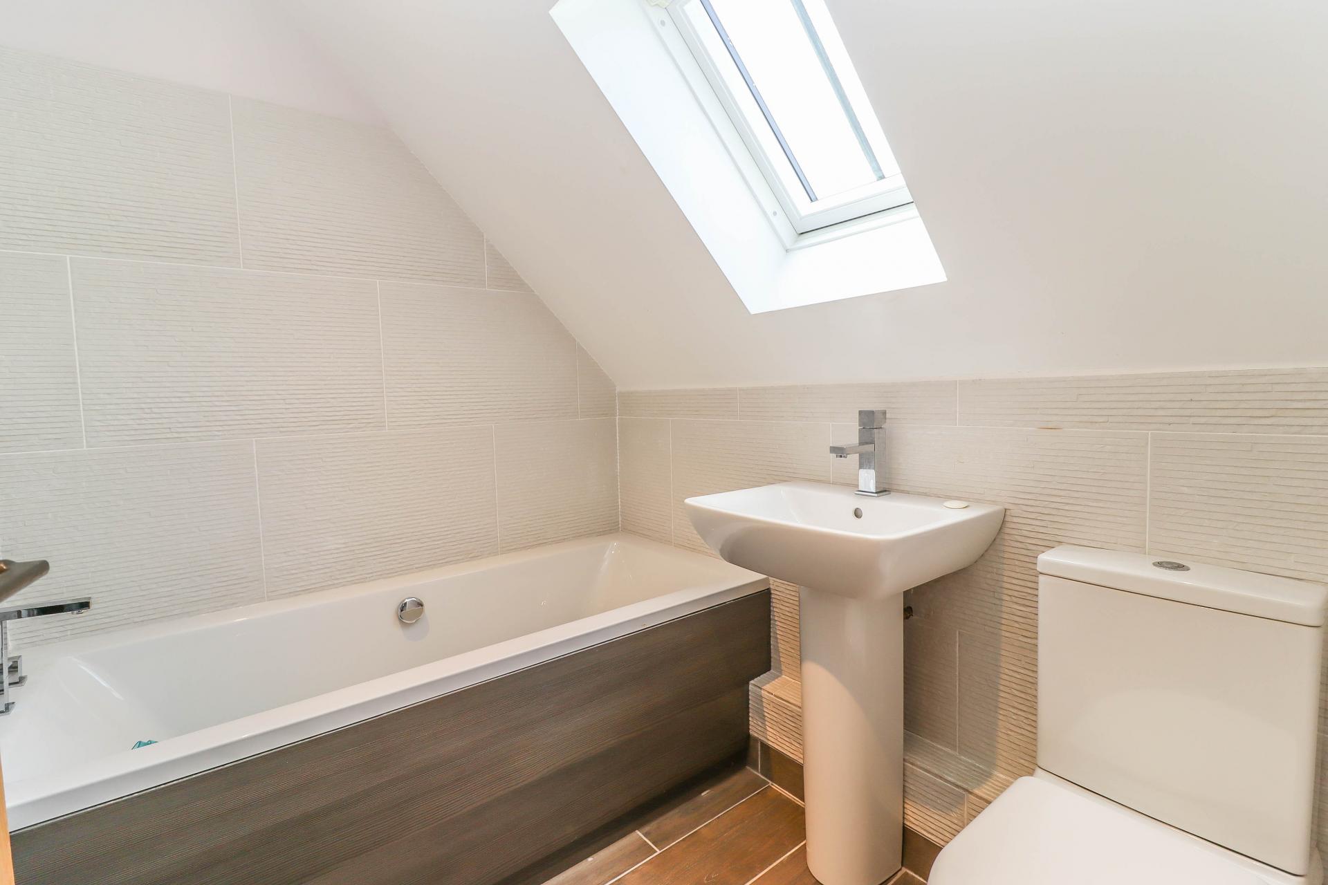 FAMILY BATHROOM White suite comprising panelled bath with mixer tap and retractable hand held jet. Pedestal wash hand basin with mixer tap. Low level WC. Ceramic tiled floor. Textured ceramic tiled walls. Grey matt finish radiator. Frosted Velux sky light. Shaver socket.