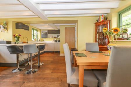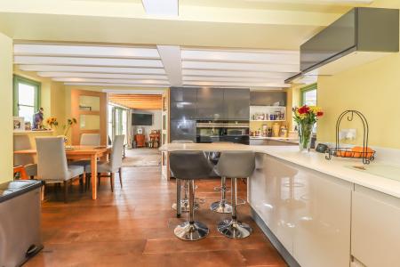 LARGE OPEN PLAN KITCHEN / BREAKFAST ROOM Corian work surface with tiled splash back and Corian breakfast bar. Ceramic sink unit with mixer tap and drainer. Extensive range of high gloss finish cupboards and drawers incorporating wide pan drawers and display shelving. Integrated larder fridge, under-counter freezer, dishwasher and recycling store. Built-in Siemens oven/grill, microwave/combination oven and warming drawer. Four ring Siemens induction hob with extractor hood above. Cottage style window to rear aspect with views over the gardens. Further windows to front aspect. Painted ceiling timbers and exposed joists. LED down lighters. Engineered oak flooring. Oak door into: