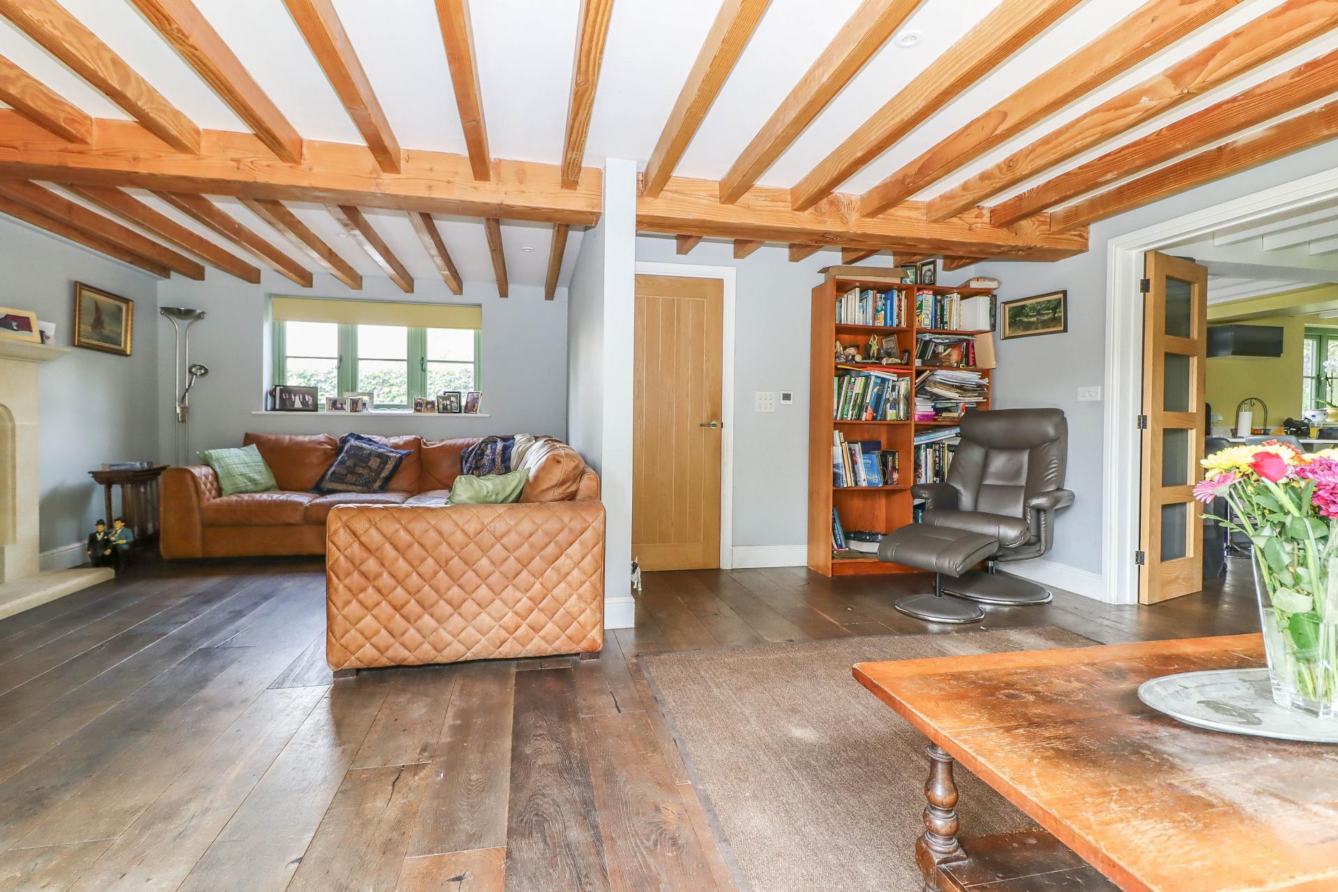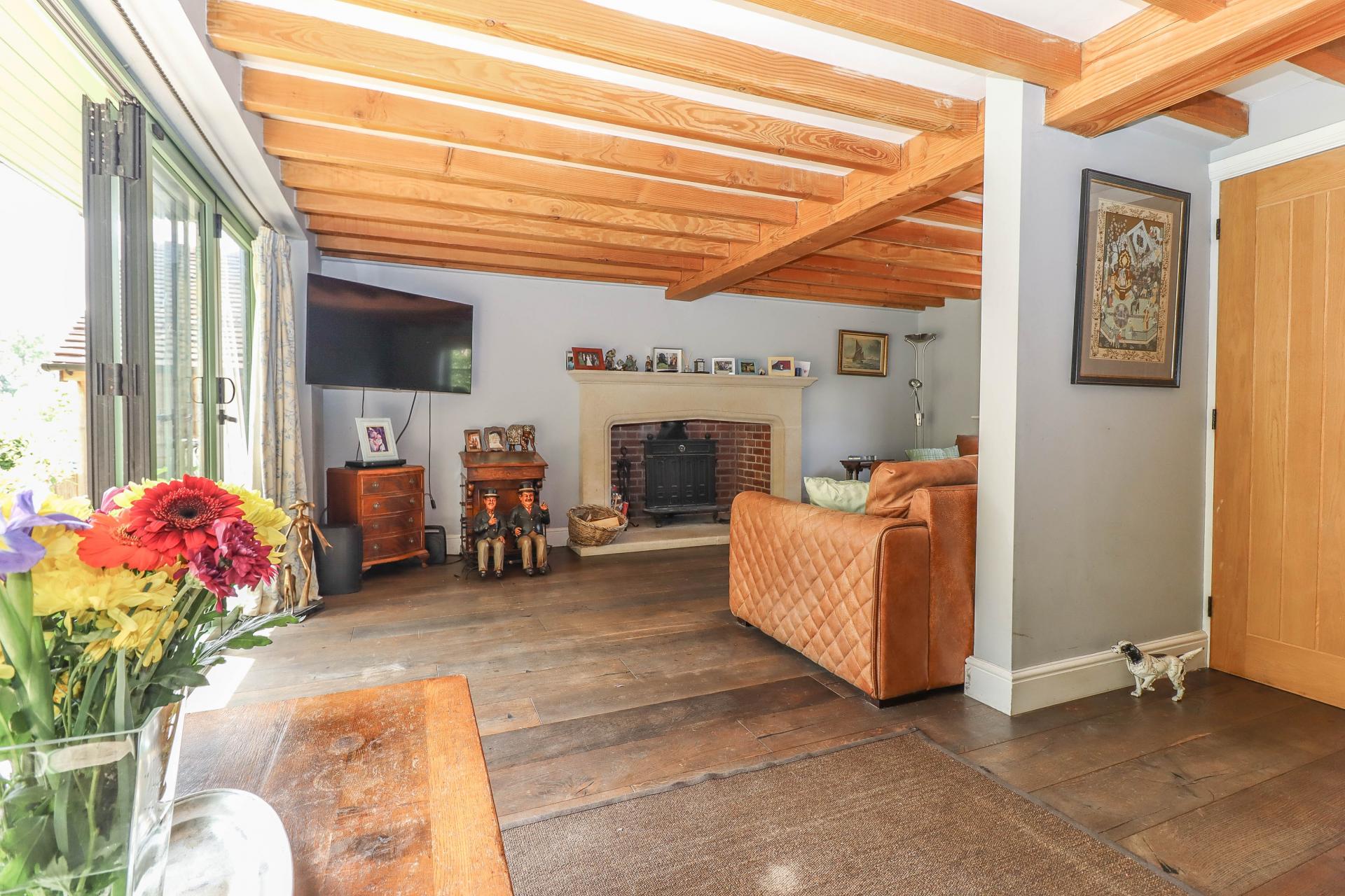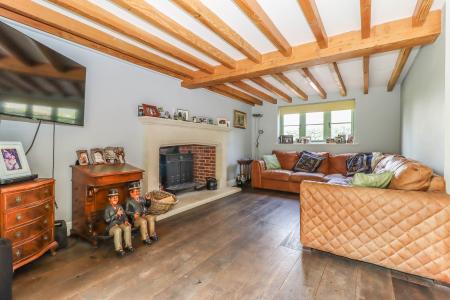 SITTING ROOM (Dual aspect) Large open brick fireplace with Bath stone mantelpiece and hearth, housing double fronted log burning stove. Exposed ceiling beam and joists. Cottage style window to front aspect. Engineered oak flooring. LED down lighters. Lamp ring with central switch.