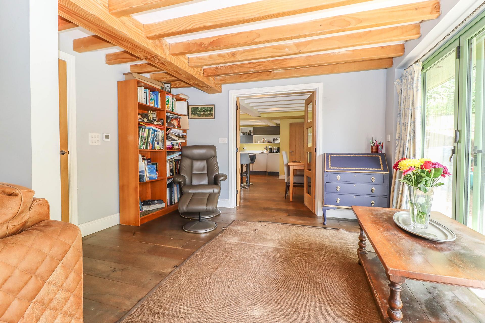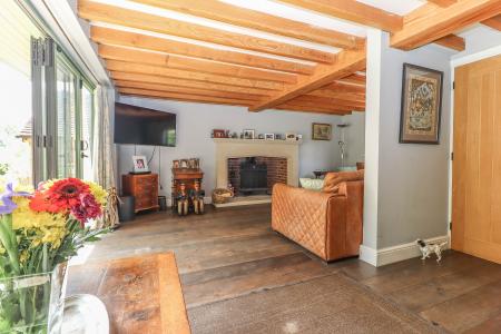 DINING AREA Aluminium folding doors extending the full width of the room giving access onto the terrace and attractively landscaped garden with open views to one side. Engineered oak flooring. Hatch in floor concealing large tanked cellar. Exposed ceiling beam and joists. LED down lighters. Oak glazed double doors open into: