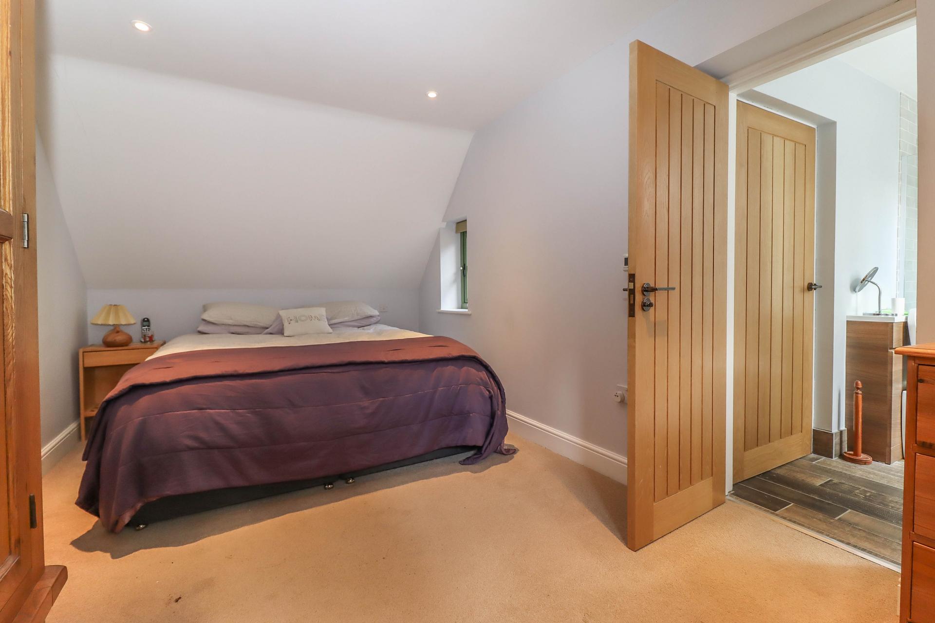 BEDROOM TWO / GUEST SUITE (Dual aspect double bedroom) Dormer window to rear aspect. Further window to gable end with glorious views over countryside towards water meadow. LED down lighters. Oak door into: