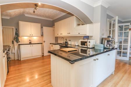 KITCHEN Oak effect flooring. Ceramic Belfast sink unit with mixer tap. Polished granite work surfaces including wide peninsular, painted T&G panel splashbacks. Range of high and low level cupboards and drawers. Wide Belling range/cooker with five zone induction hob, two large ovens, grill and warming area. Glass splashback. Integrated fridge and freezer. Recess and plumbing for dishwasher. High ceiling with coving. Spot lights. Panelled door to rear lobby. Further latch door to deep under stairs storage cupboard with light.