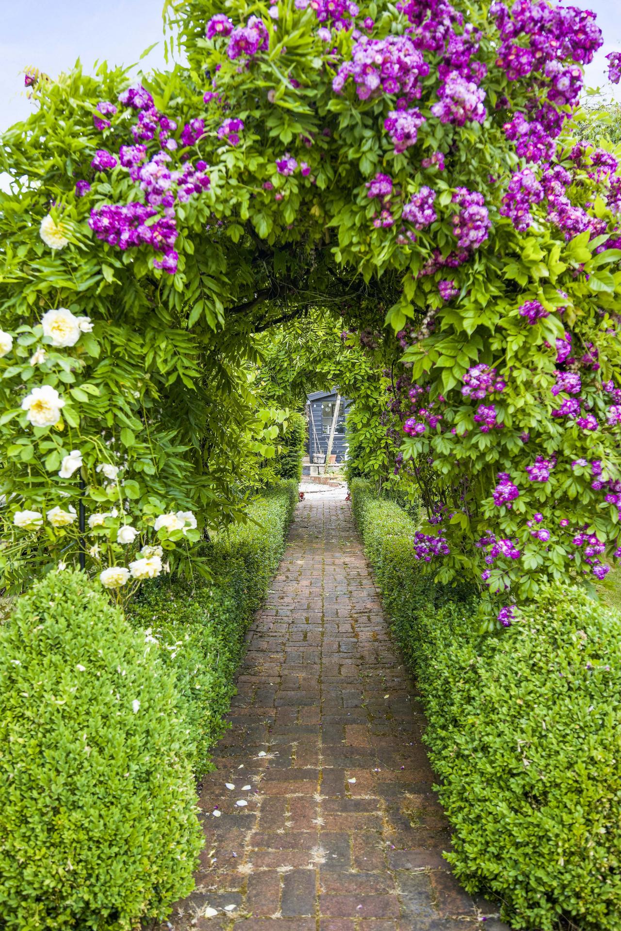 MAIN GARDEN Brick paved path with topiary buxus hedging to either side and two archways covered in Wisteria and climbing plants. Level lawned areas to either side. Ornamental birch tree and surrounding bench. Deep borders and beds with an abundance of shrubs and specimen trees. Large garden shed. Yew hedging divides the main garden and upper garden. The latter has been further divided by buxus hedge into kitchen garden area and landscaped entertaining area.