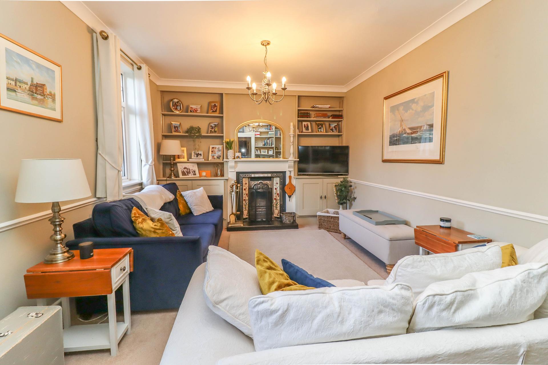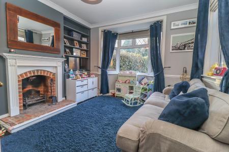 SITTING ROOM (Dual aspect) Open brick fireplace with raised herringbone brick hearth. Decorative mantlepiece. Pastel colour washed built-in dresser units to either side of the chimney breast. Wide bay window to front aspect. Further window to side aspect. Exposed painted floorboards. High ceiling with coving. Dado rail.