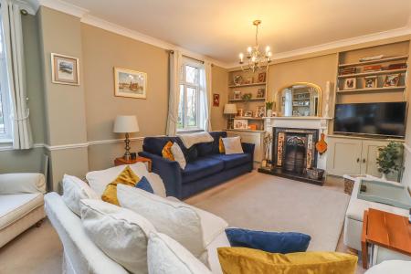 LIVING ROOM High ceiling with coving. Pendant light point. Cast iron fireplace with raised ceramic tiled hearth. Painted timber mantlepiece. Built-in dresser units to either side of chimney breast. Further bespoke book/display shelving to either side of the doorway and extending into one corner. Two large windows to front aspect. Dado rail.