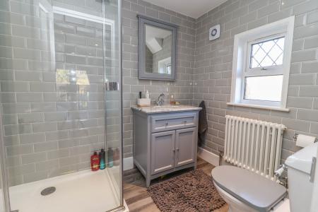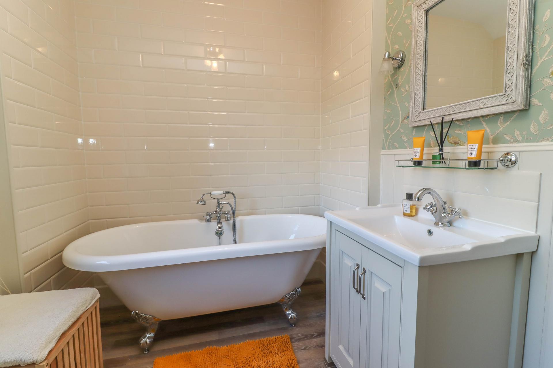 FAMILY BATHROOM (Large and well appointed) Suite featuring large four claw roll top bath with central mixer tap/handheld shower attachment, metro tile surround. Wash stand with ceramic basin above. Mixer tap. Glass shelf. Wall lights over double cupboard beneath. Low level WC. Traditional style radiator/towel rail. Limed oak effect flooring. Decorative T&G panelling to walls. Spot lights. Window to rear aspect with view toward paddock.