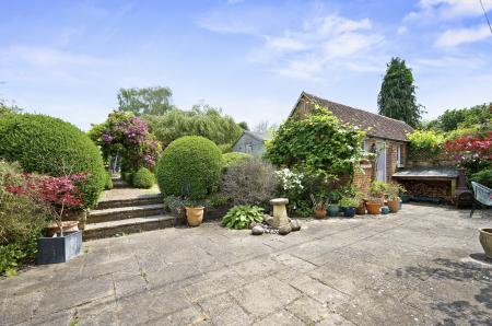 TERRACE Substantial sheltered and private paved terrace area ideal for barbeques and entertaining. Slate covered log store. Well screened by hedging and wall with trellis above. Large topiary buxus balls to either side of wide paved steps rising to main garden. To the rear of the terrace there is: