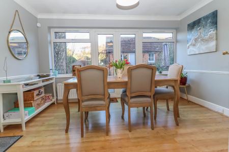DINING ROOM Central glazed double doors onto rear terrace with large high level windows to either side extending to full width of room. Oak effect flooring. Pendant light point. Ceiling coving. Internal door into integral double garage. Wide opening into: