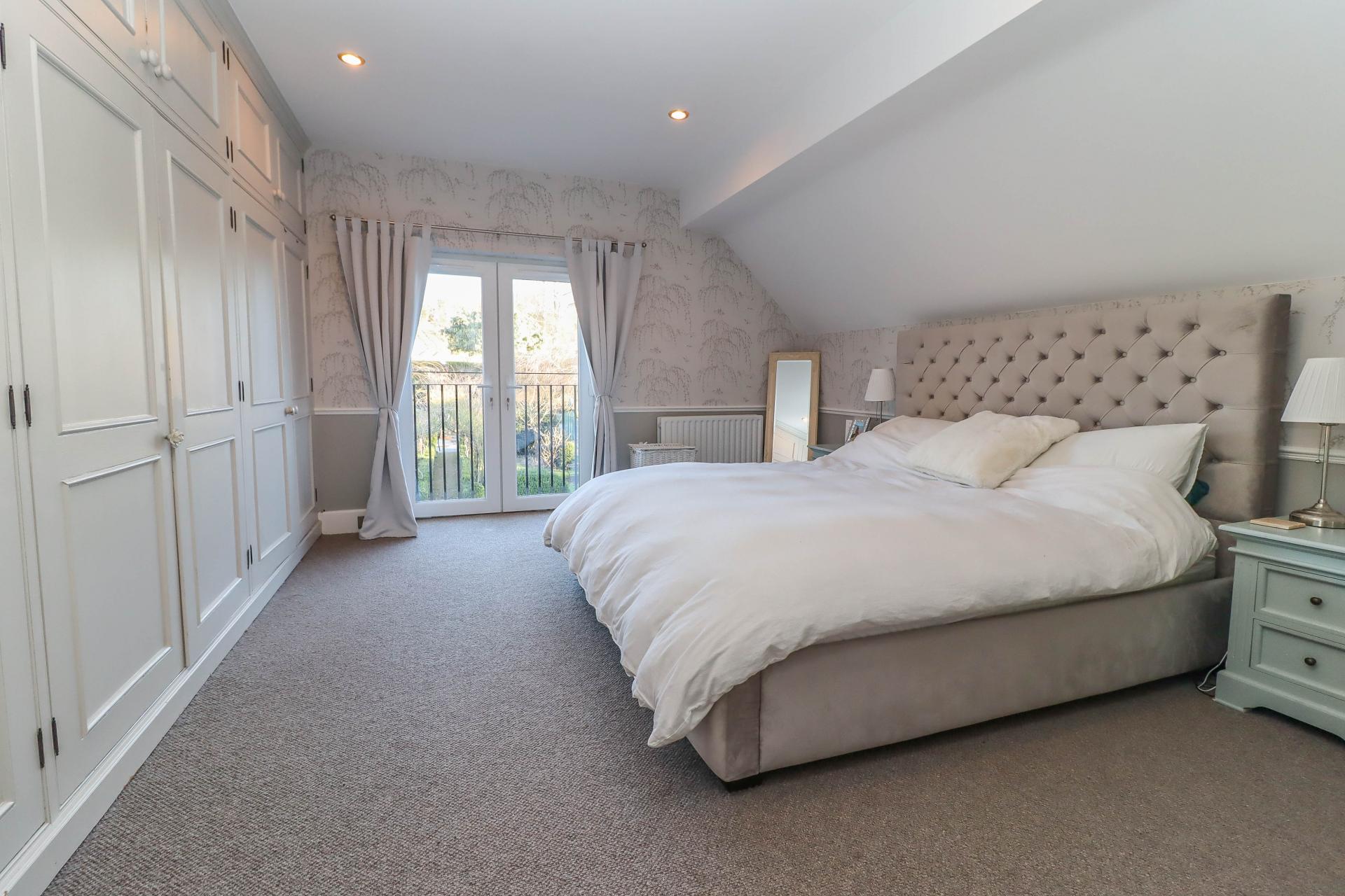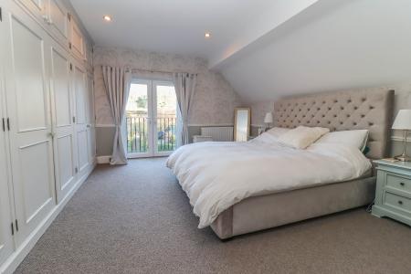 PRINCIPAL BEDROOM SUITE A large light and airy suite and feature of this home with glazed double doors and Juliet balcony enjoying views over the landscaped rear garden to paddock land beyond. Comprehensive built-in storage to the length of the room. Down lighters. Dado rail. Panelled door to: