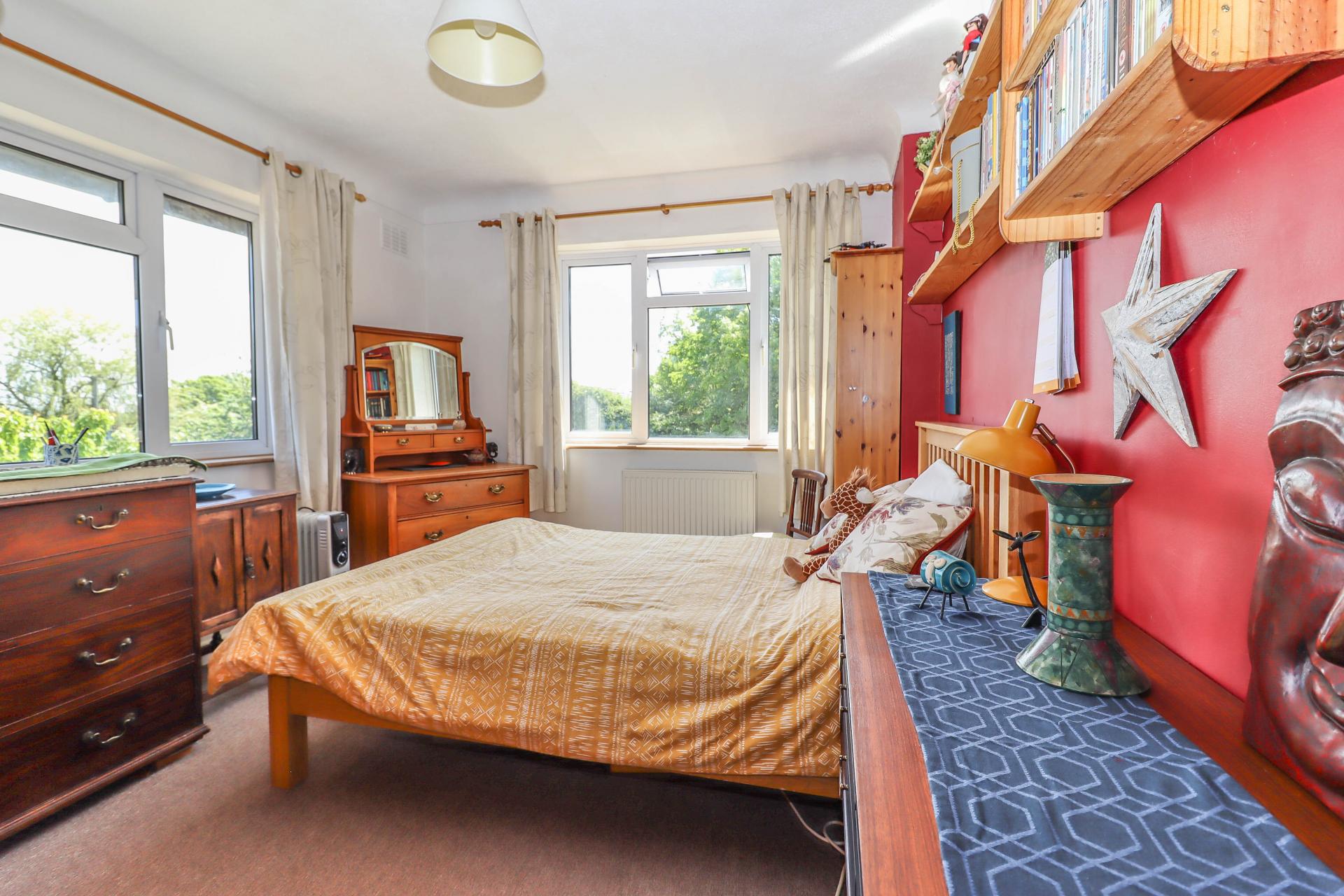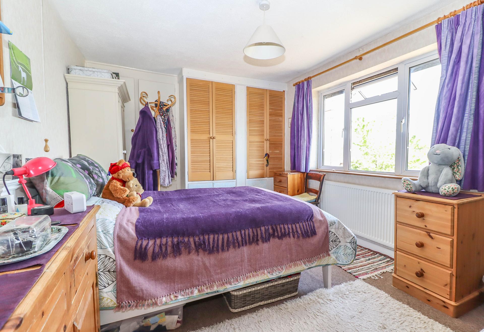 BEDROOM THREE (Dual aspect double bedroom) Window overlooking main garden. Further window with far reaching views toward woodland. Built-in double wardrobe cupboard. Shelving. Pendant light point.
