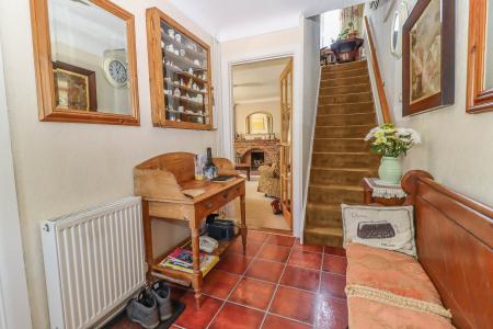 RECEPTION HALL Staircase with hand rail rising to first floor. Pendant light point with decorative rose. Bevel edge glazed door into living room. Panel door into dining room. Part glazed door into farmhouse style kitchen/breakfast room.