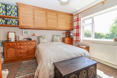 BEDROOM TWO (Large double bedroom) Window with views over the attractively landscaped garden and beyond towards meadowland. Built-in wardrobe cupboards and high louvre fronted cupboards. Shelving. Ceiling light point.