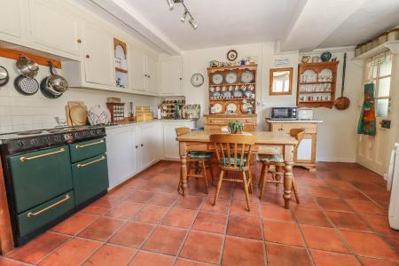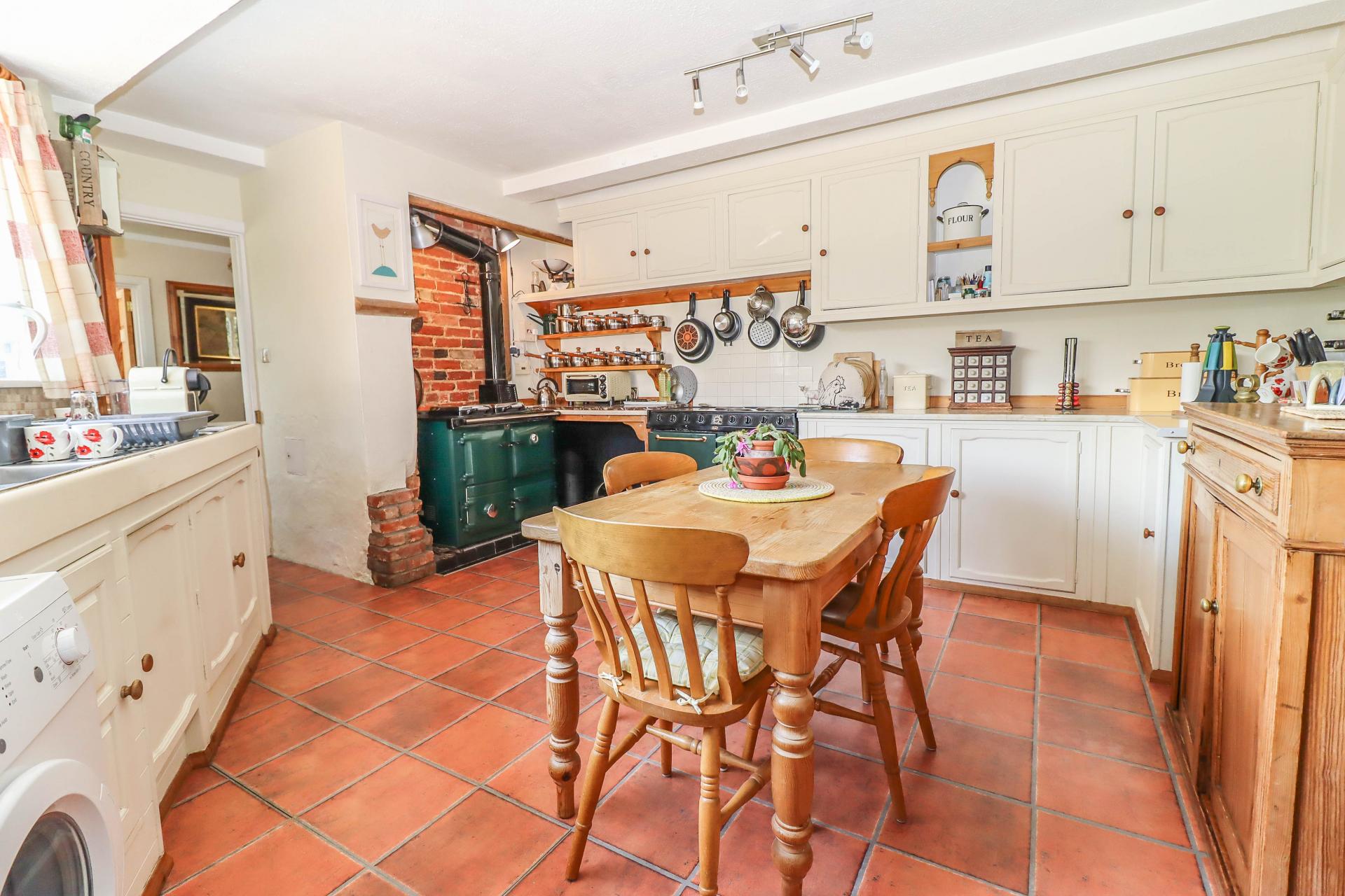 FARMHOUSE STYLE KITCHEN /BREAKFAST ROOM Brick alcove with solid fuel fired Rayburn on plinth, work surface to side, shelf and cupboards above. Stainless steel sink unit with mixer tap and drainers to either side, travertine/mosaic tiled surround. Range of high and low level cupboards. Roll top work surfaces. Space for fridge/freezer. Space and plumbing for washing machine. Window to front aspect. Ceiling spot lights. Part obscure glazed door into: