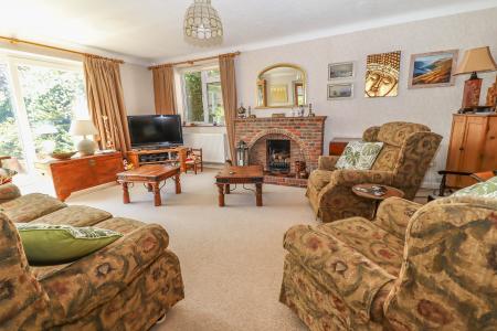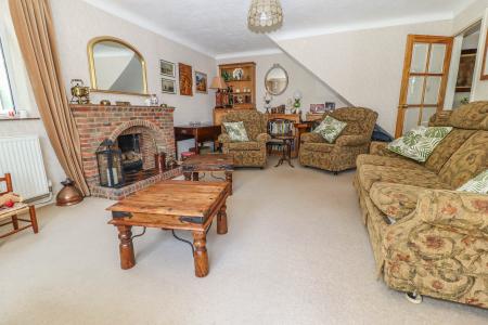 LIVING ROOM (Large dual aspect reception room) Open brick fireplace with quarry tiled hearth. Sliding glazed door with glazed panel to side opening onto the garden. Window to side aspect. Pendant light point with decorative rose. Small pane obscure glazed door into: