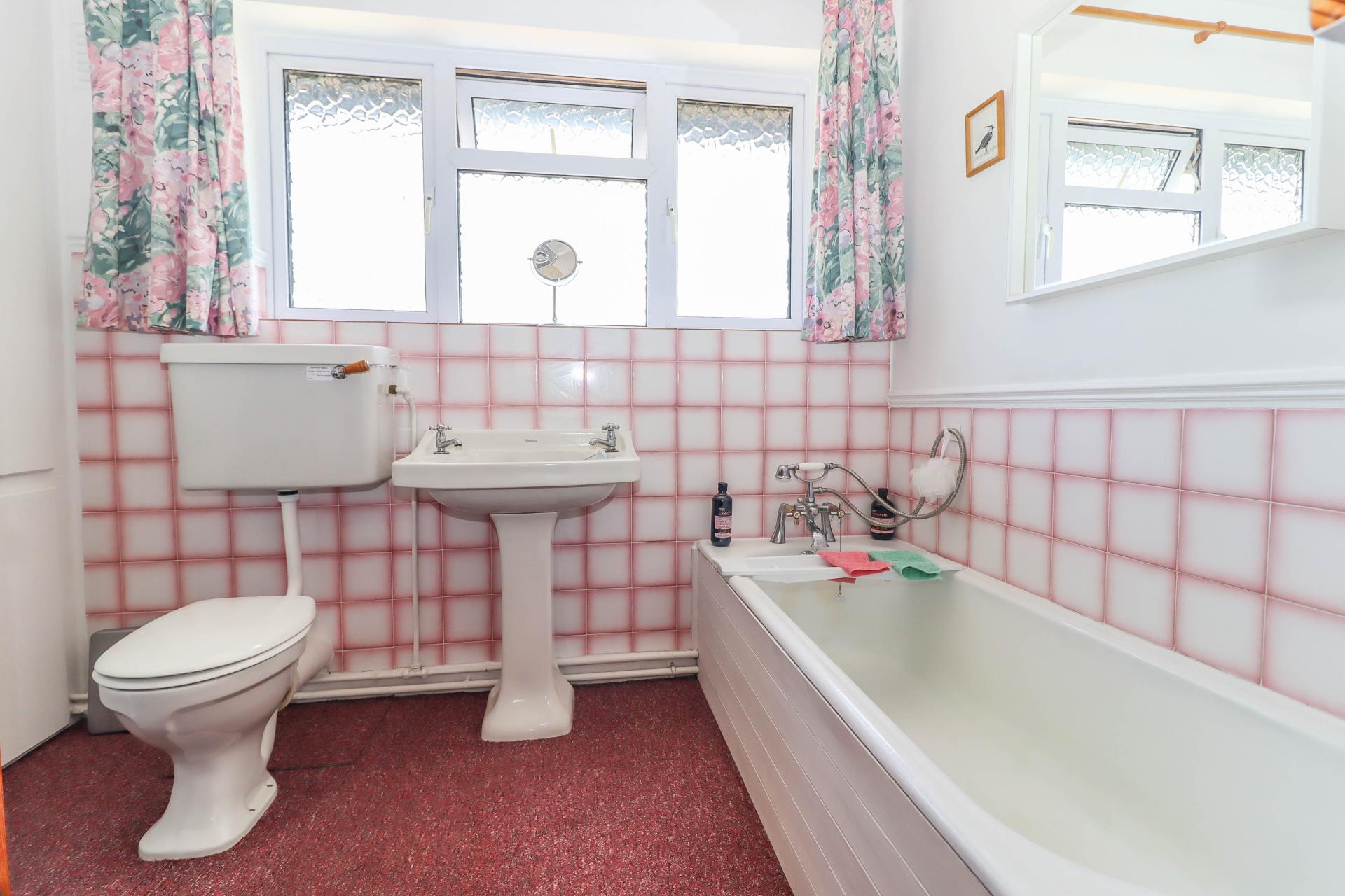 FAMILY BATHROOM White suite comprising cast iron bath with mixer tap/shower attachment, mirror fronted cabinet to end. Pedestal wash hand basin. Low level WC. Cupboard housing lagged copper cylinder with immersion heater and slatted shelving. Obscure glazed window. Ceiling light point.