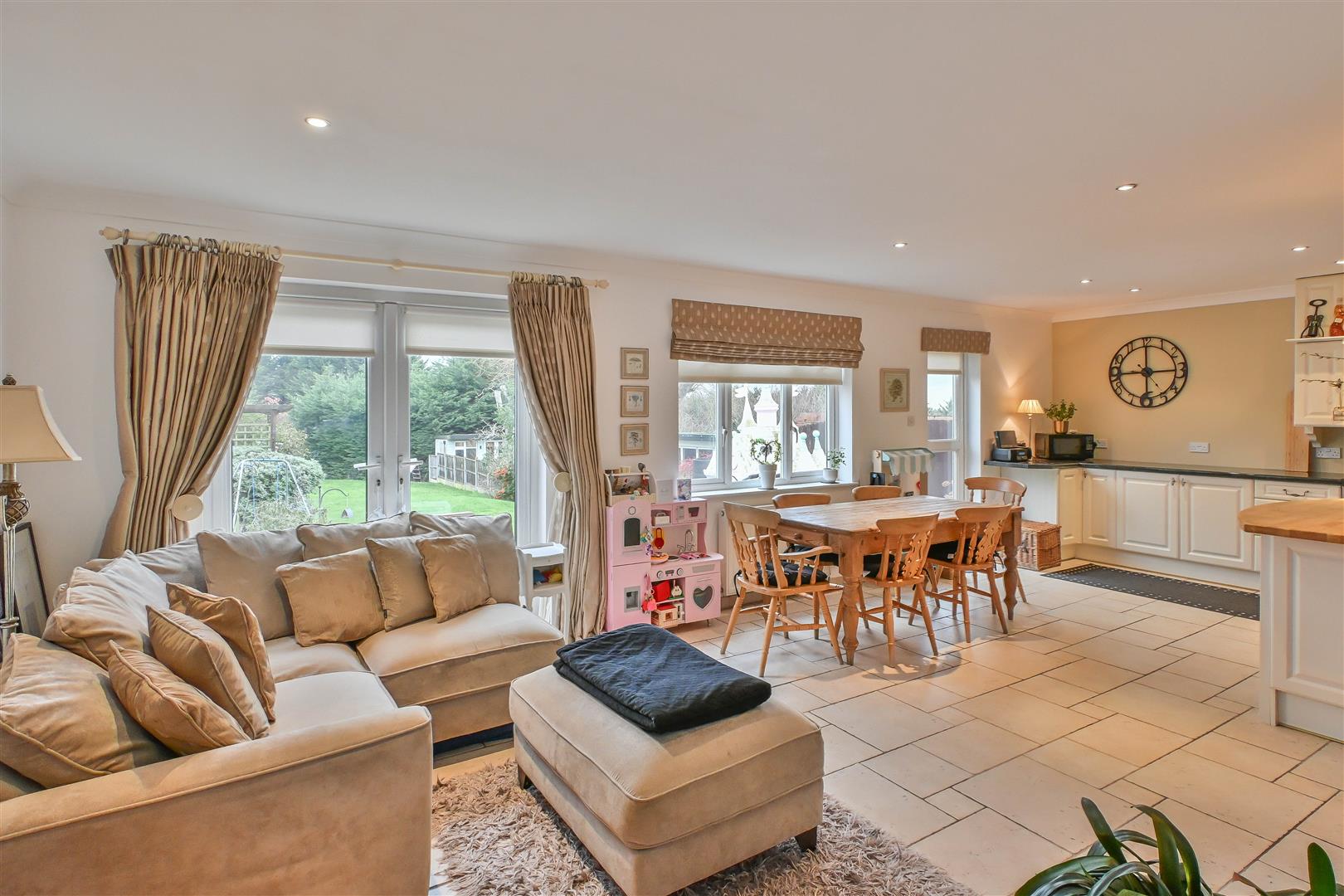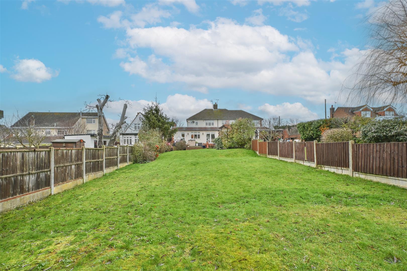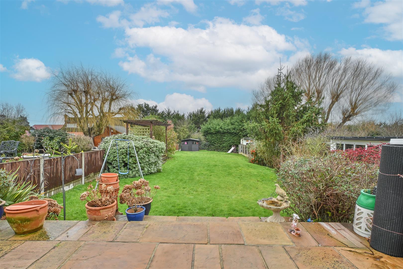 Externally, the south facing rear garden begins with a paved patio area, leading onto a vast, well-maintained lawn bordered by mature shrubs. To the front, a shingle driveway offers ample off-street parking.