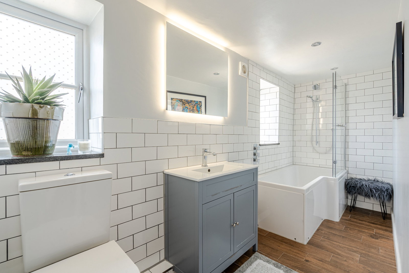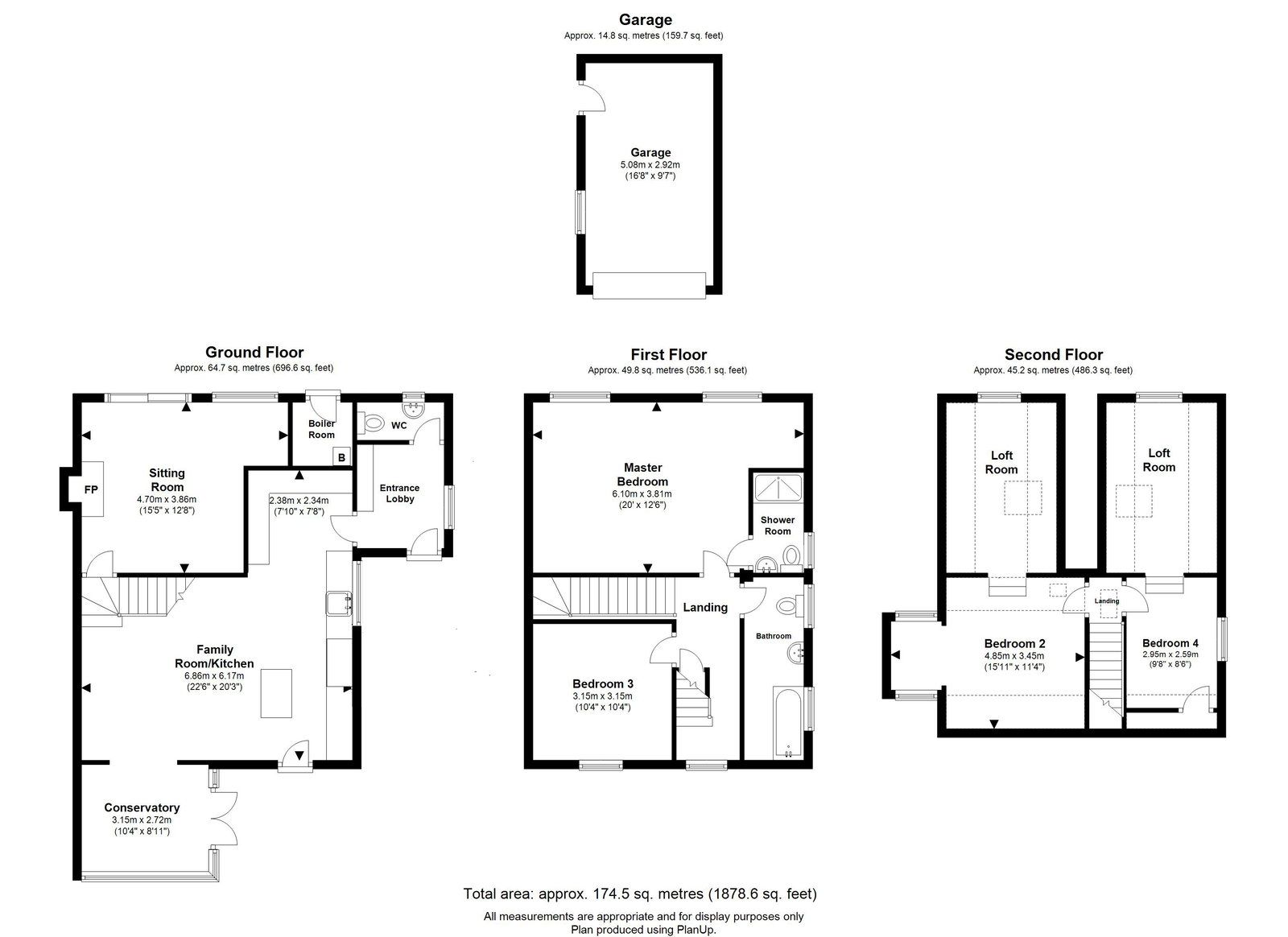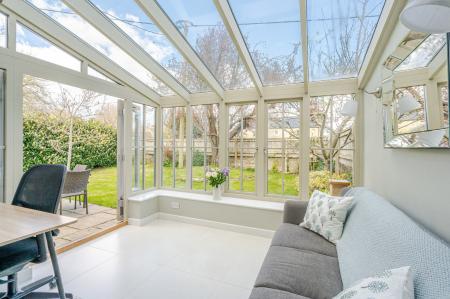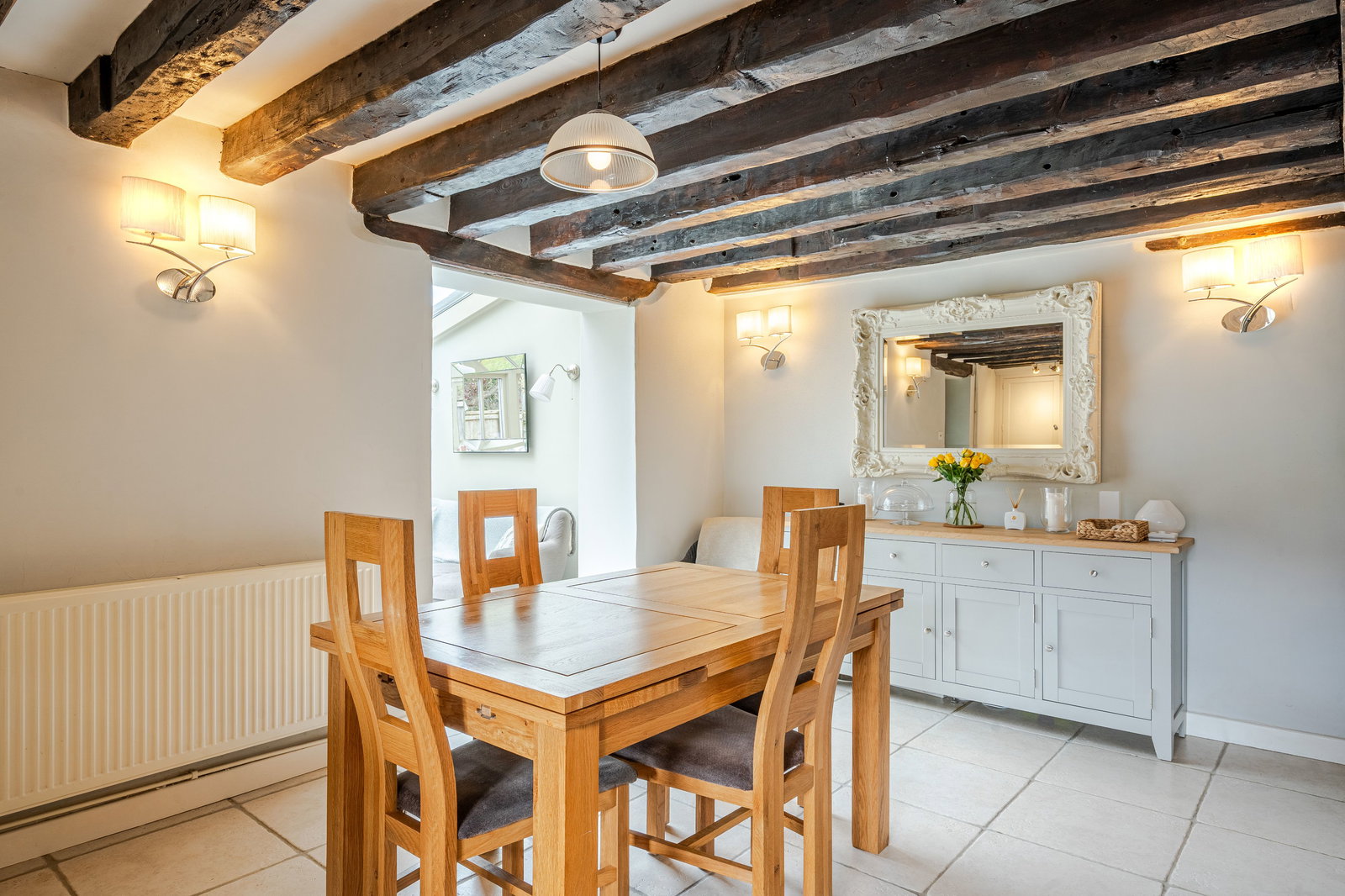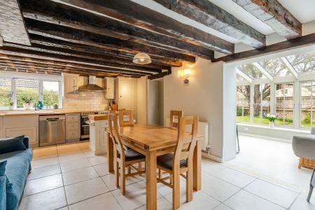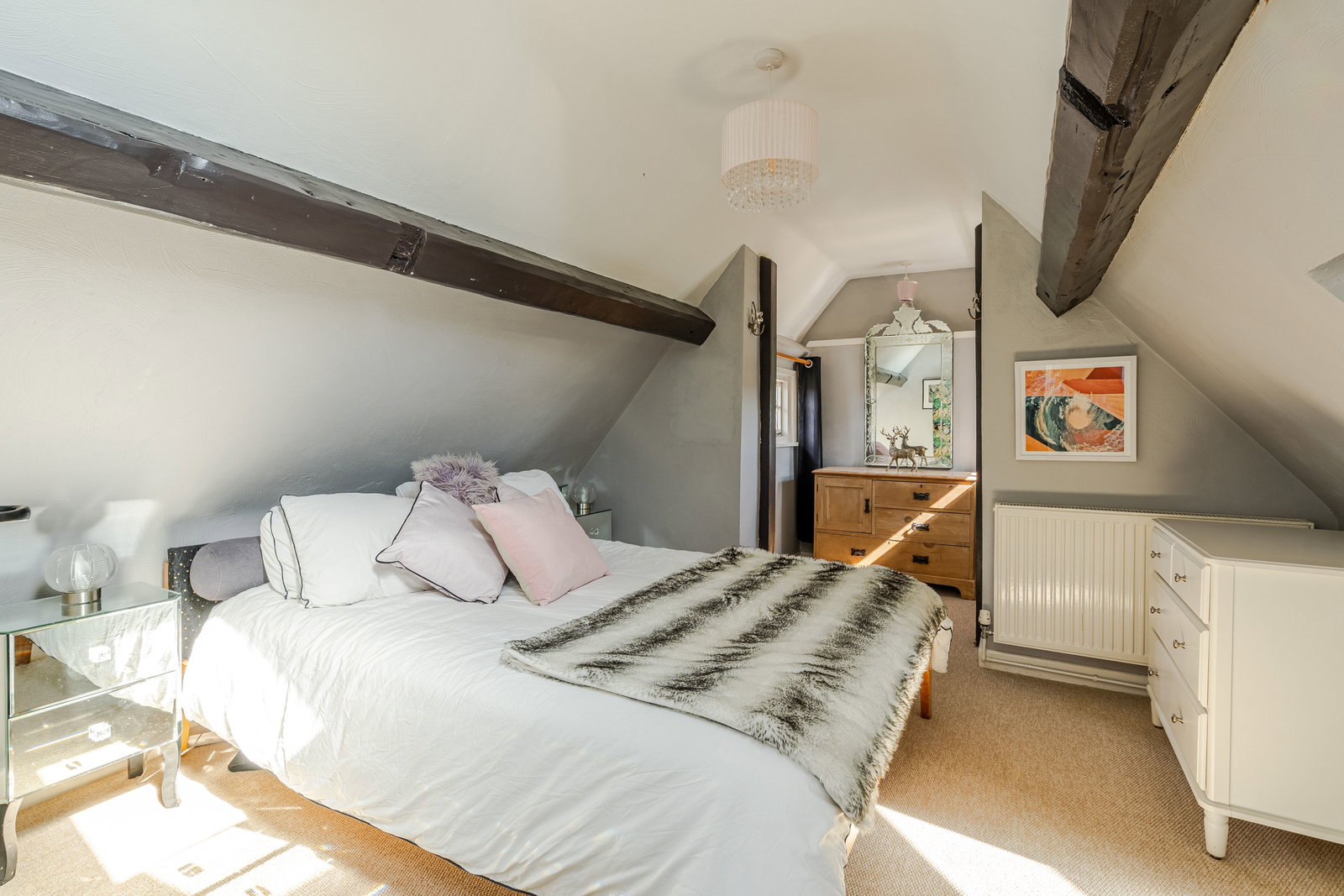 Upon entering through a convenient side porch with an adjoining WC, the ground floor opens to a sizable kitchen/family room, complete with flagstone-style flooring and a range of fitted units. This area flows into a bright conservatory, complete with underfloor heating and overlooking the front garden. A cosy sitting room at the rear, with a warming fireplace, has sliding doors that open to the private, sunny rear garden. The first floor offers two comfortable double bedrooms, including the principal bedroom with an en-suite shower room benefiting from underfloor heating. A modern family bathroom, with a shower over the bath, completes this level. The top floor offers two versatile attic bedrooms, each adjoined by further loft rooms – perfect as a charming child's playroom or additional storage.