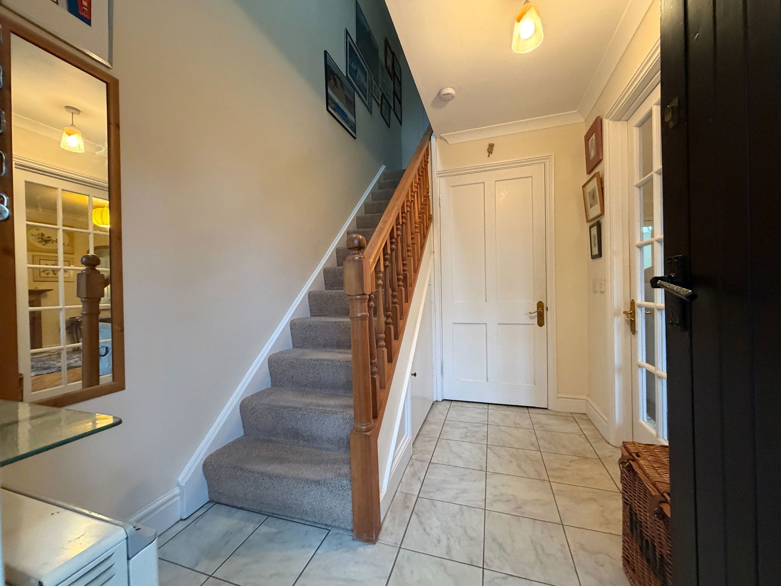 Spacious entrance with stairs to first floor, glazed door to sitting room with matching glazed side panels, electric heater and understairs storage cupboard.