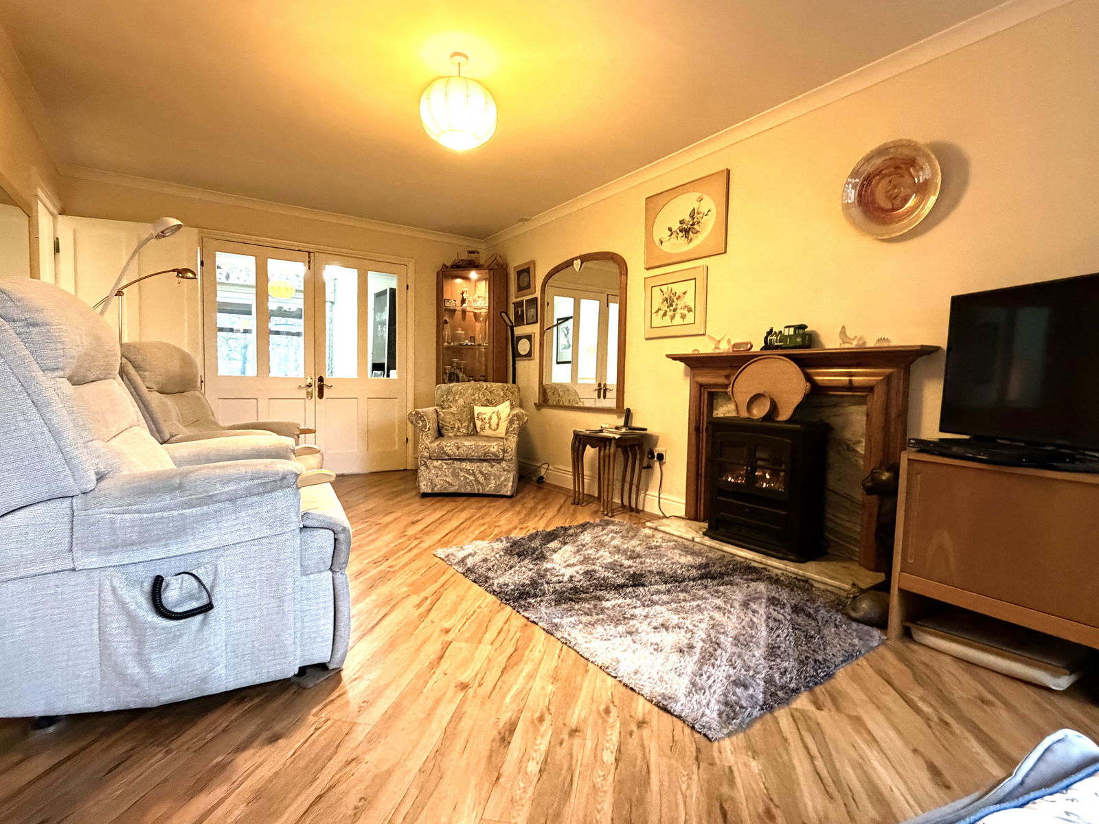 Bright and spacious sitting room with a double glazed window to front aspect, electric fire with wood mantle surround and marble effect hearth, ceiling light and electric storage heater.