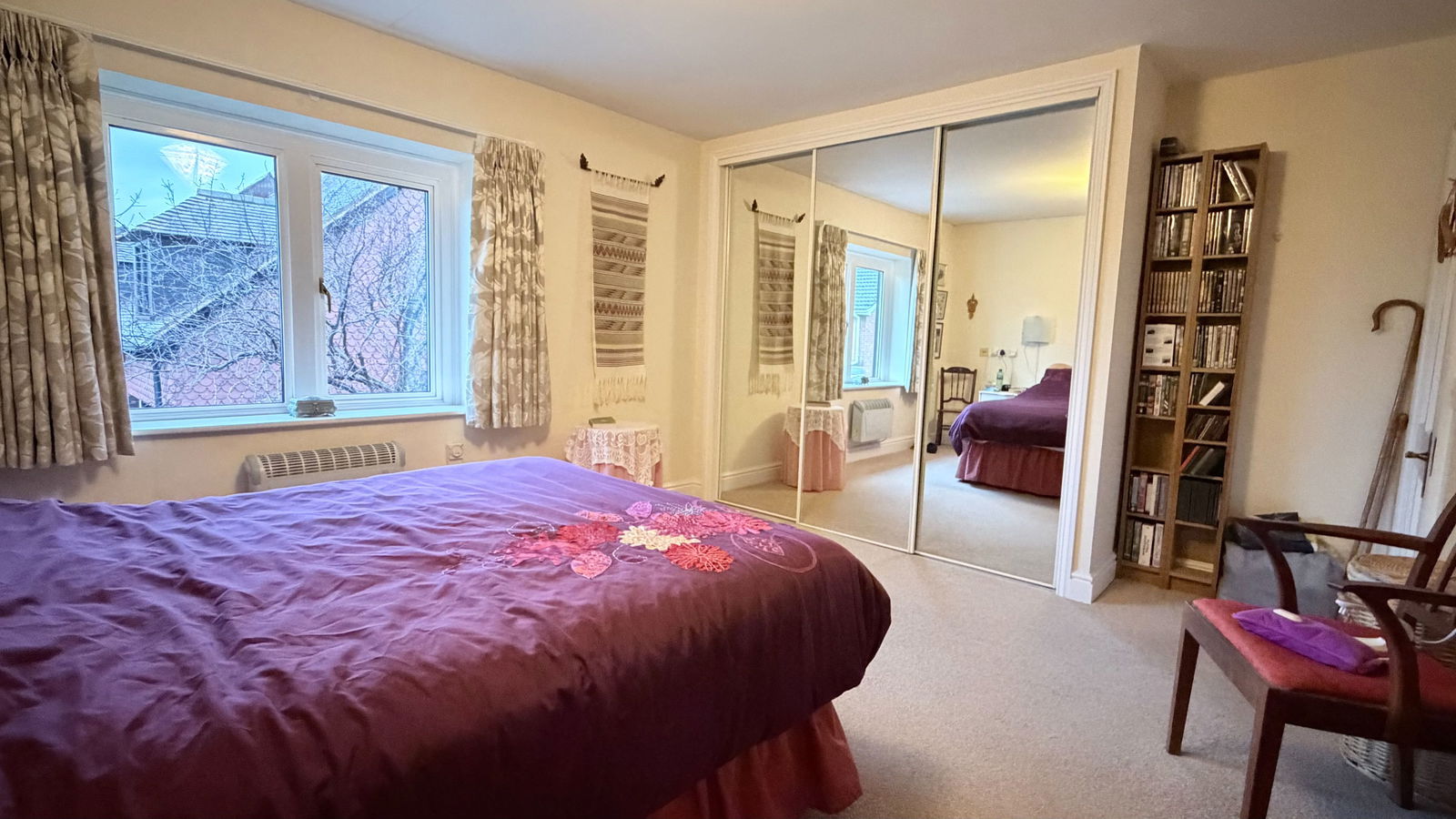 A spacious main bedroom, with front facing double glazed windows bringing in plenty of light. Ceiling and wall lights, electric heater and built in wardrobes with mirrored sliding doors.