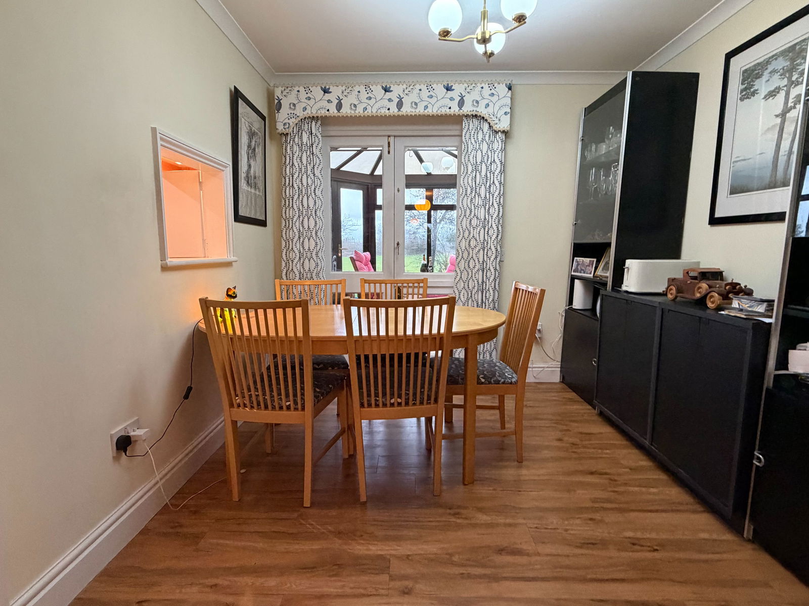 Double Glass doors leading from the lounge into the dining room, ceiling light, electric radiator and glass doors into the conservatory showing views onto the Ham.