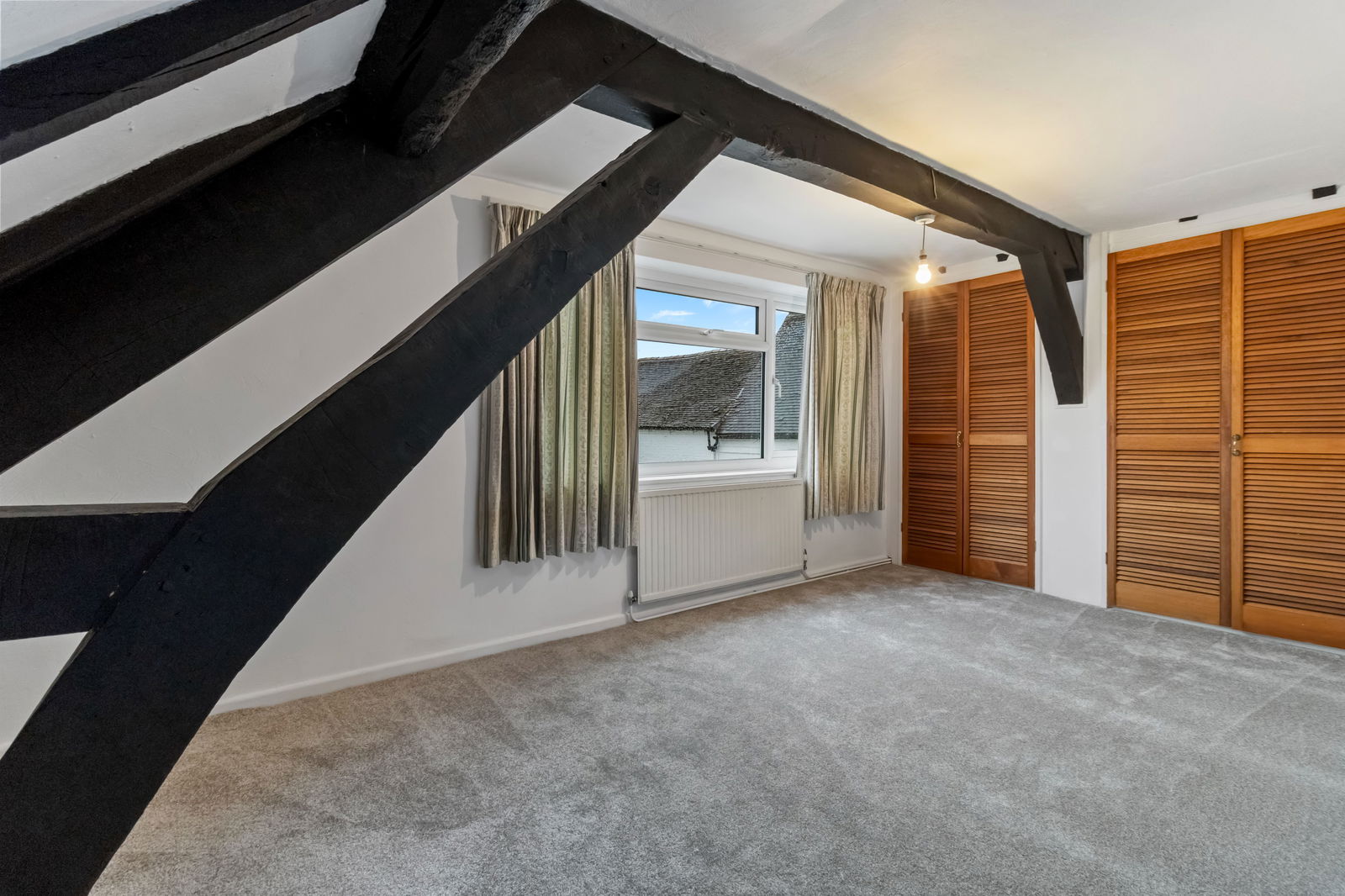 Wooden glazed Velux window to the side aspect, exposed beams, loft access, ceiling light, smoke alarm, radiator, door to the walk in storage cupboard, exposed beams, doors to:
