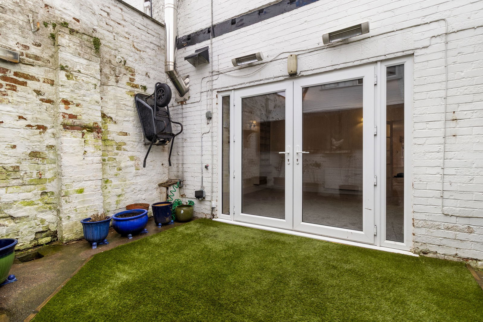 Artificial lawned area with room for a seating/dining table, room for pots and plants, bin storage area, log store, brick walls surround.