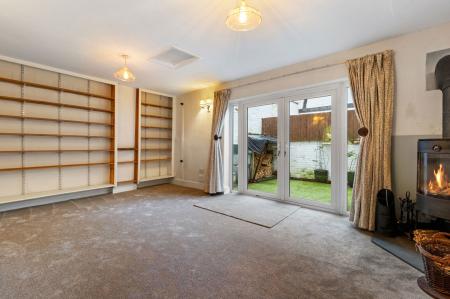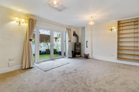 UPVC double glazed double French style patio doors and glazed side panels to the rear aspect, modern feature log burner, ceiling lights x two, wall lights x three, radiator, power points.