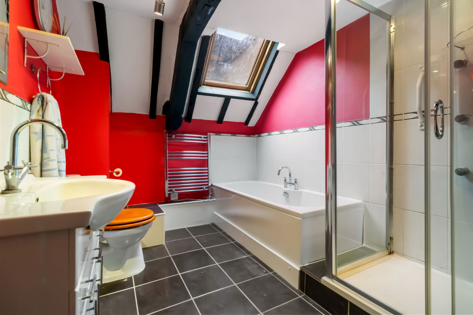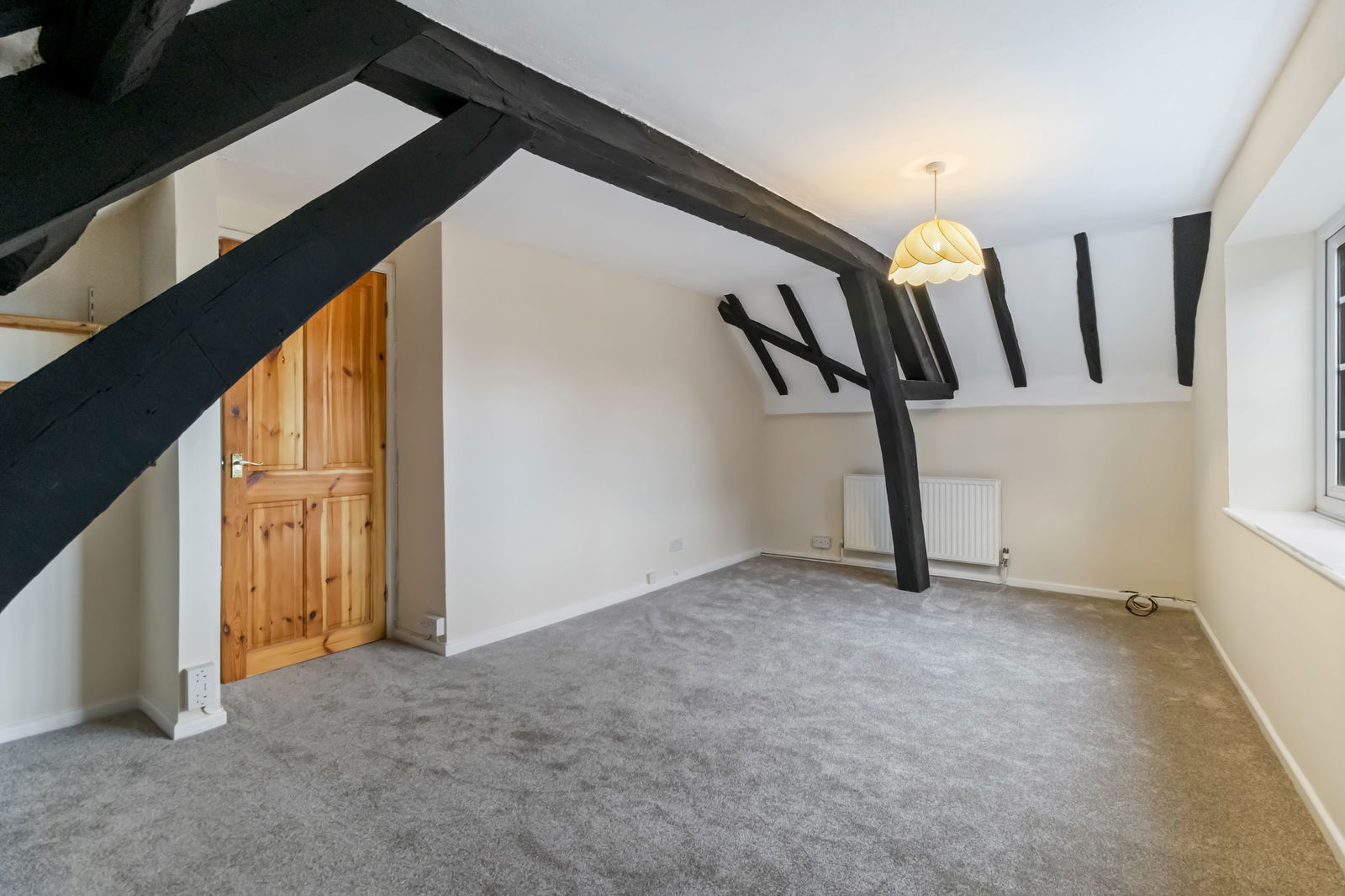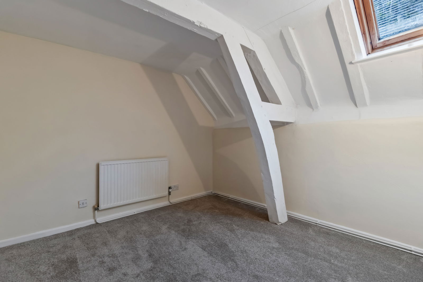 Wooden glazed Velux window to the side aspect, radiator, power points, ceiling light, exposed beams.