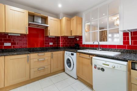 Fitted with beech effect wall and base units with work surface and part tiled splash backs over, white ceramic one and a half bowl sink and drainer with a mixer tap over, Neff waist high double oven, ceramic hob with a stainless steel extractor fan over, space and plumbing for a washing machine and tumble dryer, dishwasher and American style fridge/freezer are included in the sale, Worcester combination gas boiler (concealed in a wall cupboard), pull out full height pantry cupboard, power points, inset ceiling spot lights, tiled flooring.