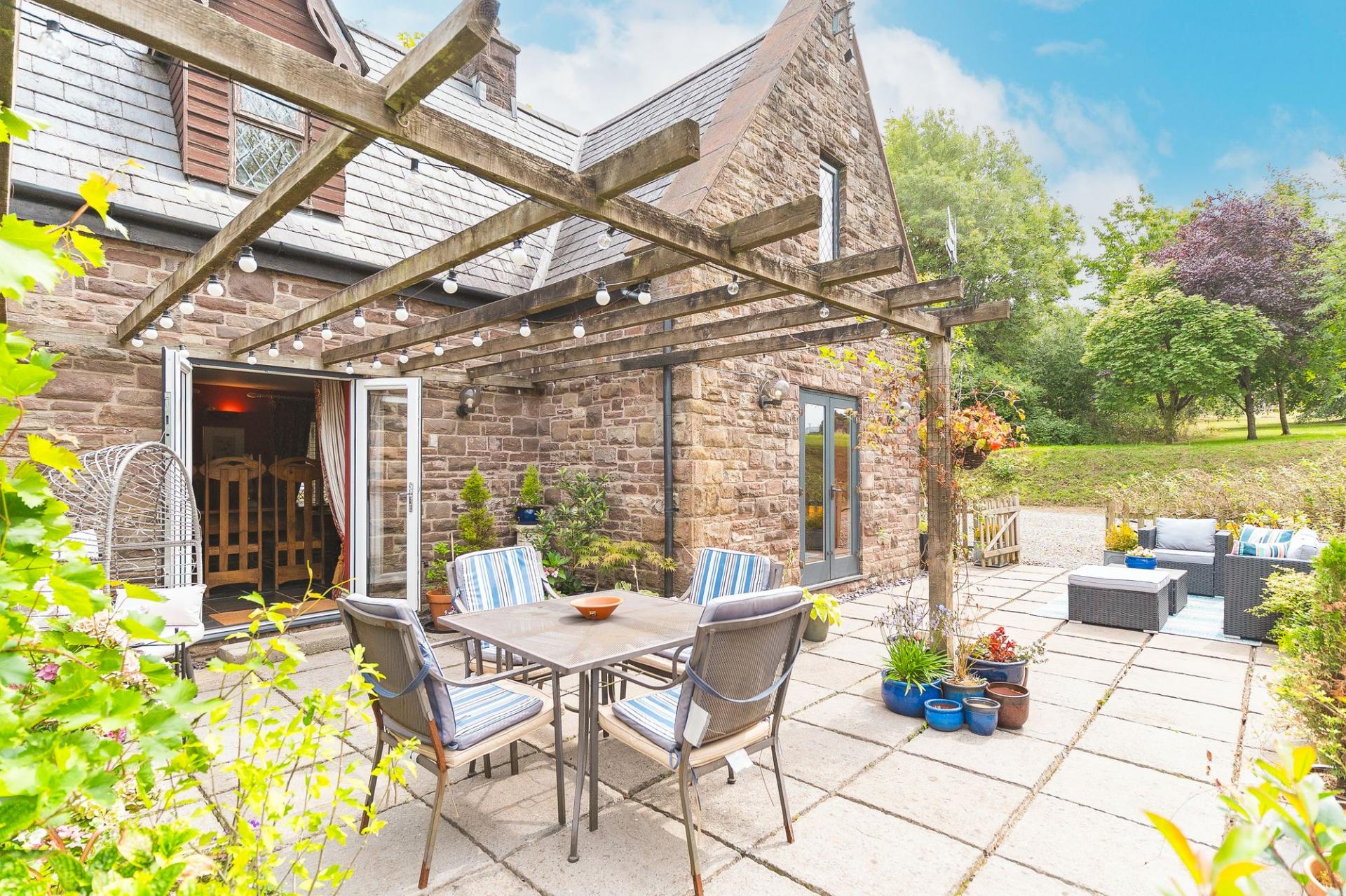 Externally, the property continues to impress. A driveway leads from the front around to a gated private parking area at the rear, offering ample space for multiple vehicles. The beautifully maintained gardens extend across large lawns with mature planting, established fruit trees, and a delightful variety of flora providing seasonal colour and interest. A generous patio directly outside the house creates the perfect spot for al fresco dining or entertaining, and there is a separate outdoor kitchen area – ideal for summer gatherings or enjoying the rural surroundings in style.