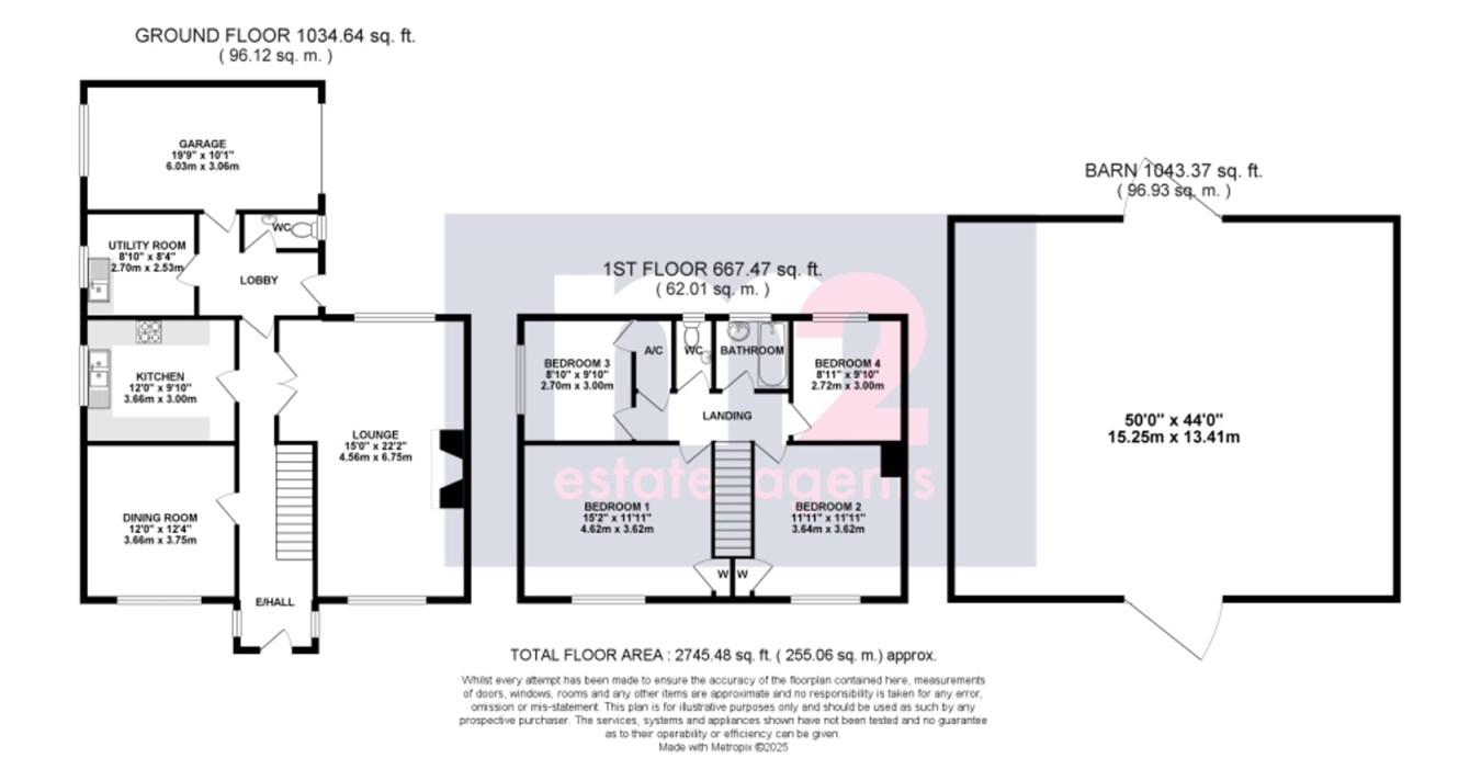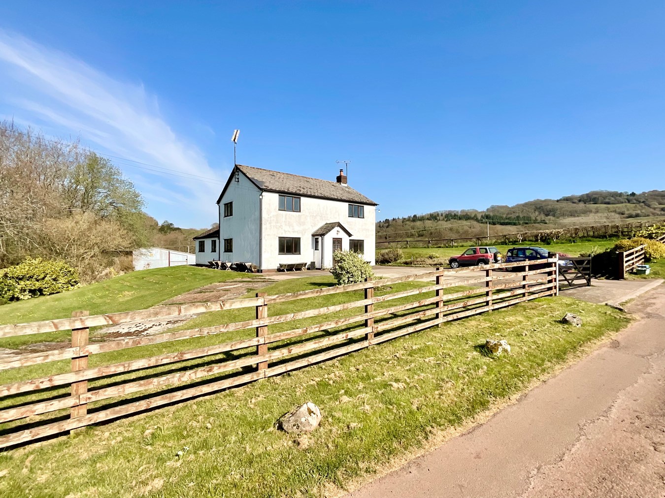 Outside the driveway is flanked by lawn, with the left boundary being the other side of the stream for which you have full access. The driveway continues down the side of the property to the rear parking area and garage. Both side lawns extend to a rear central lawn and to the 1043 sq ft steel barn. The barn features a central vehicle access and is divided into 6 bays with 3 being fully walled, offering stable conversion opportunity. The house sits on a total plot of circa 0.7 acres. Opposite the house, two fields continuing into a small peaceful woodland extending to over 11 acres with mains metered water supply.