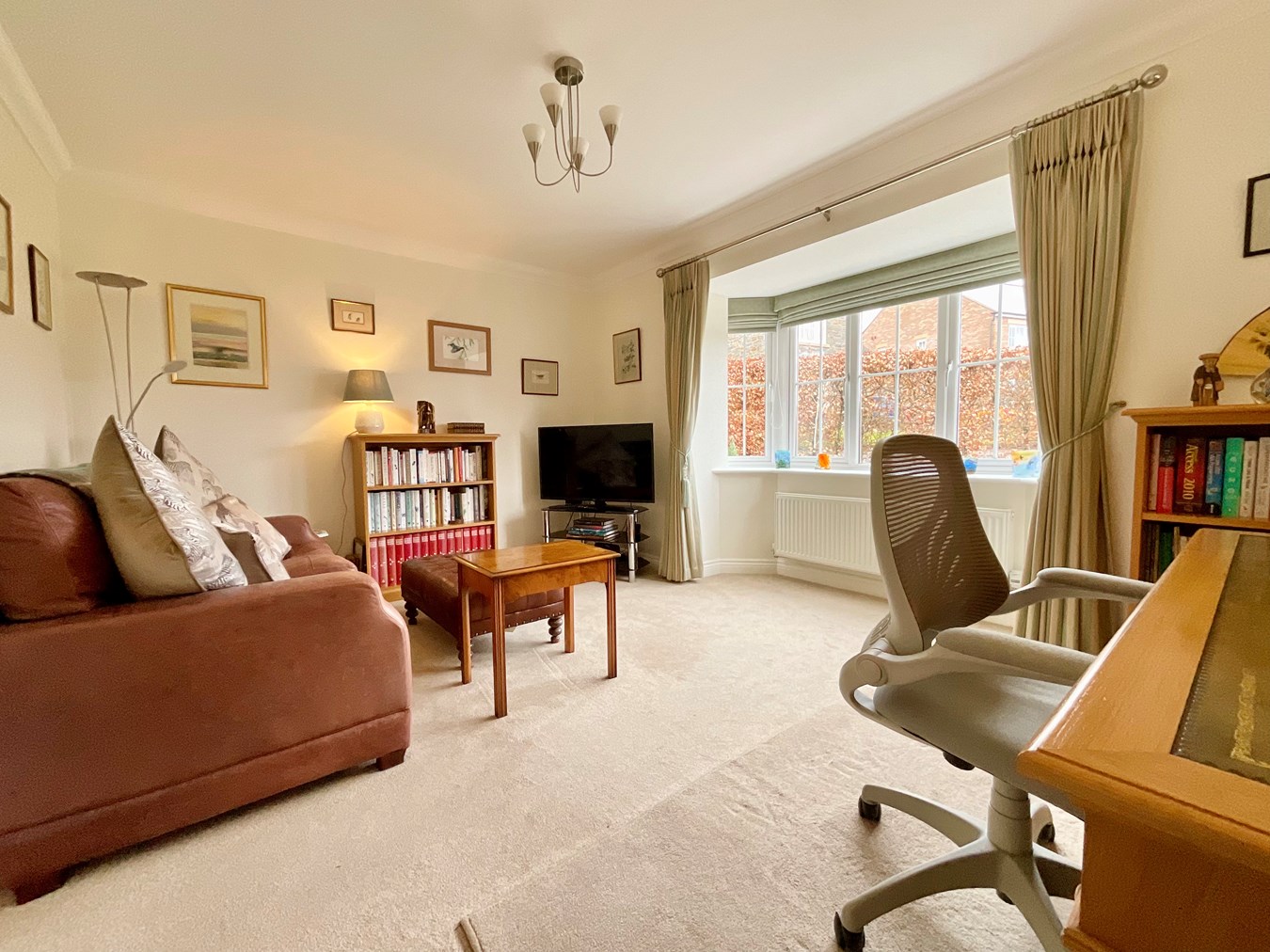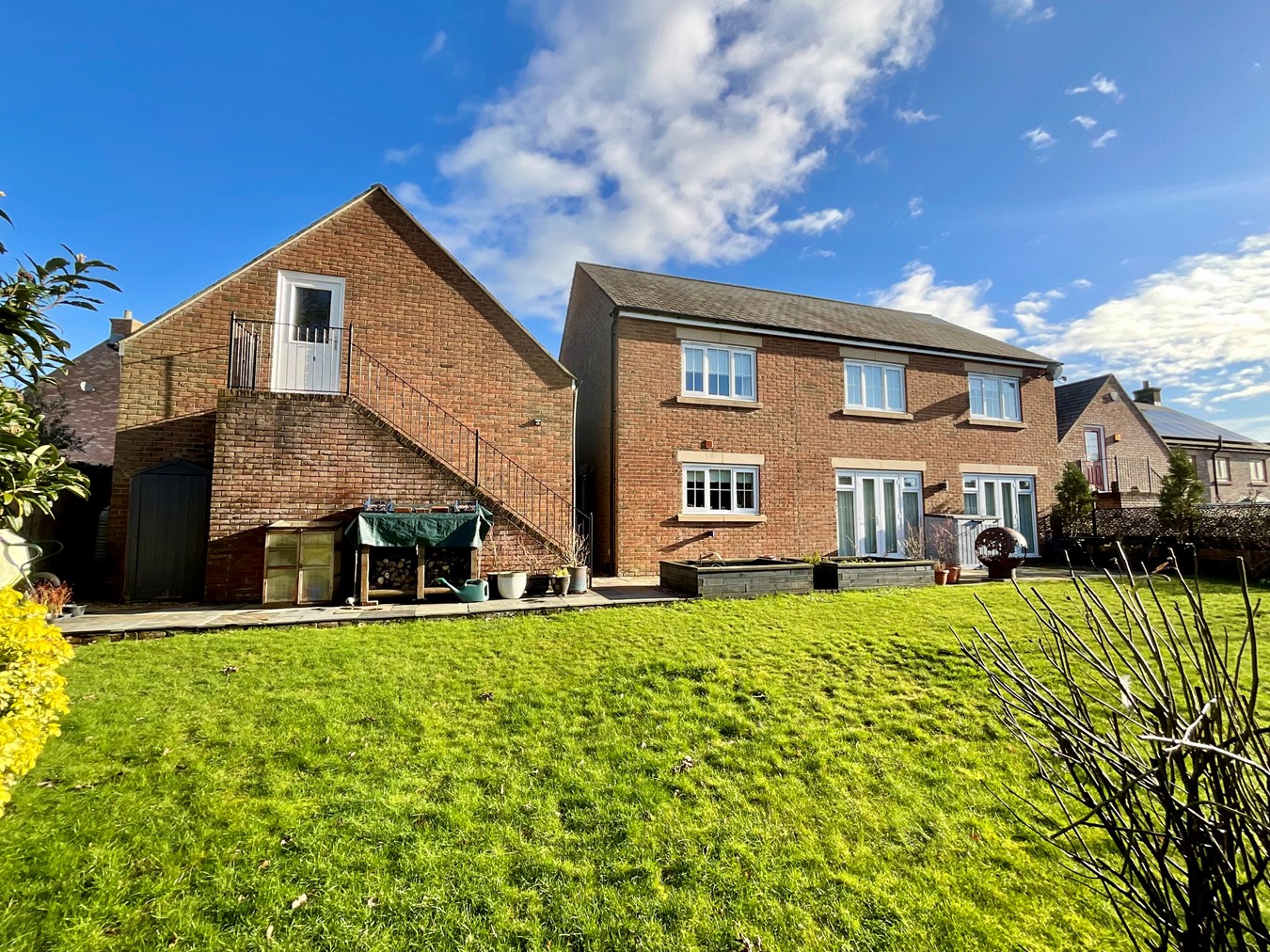 Outside a hedge lined drive leads to the parking area in front of the detached double garage. The private front garden is laid to lawn with shrub beds. The rear garden features a full with patio, raised beds and expanse of lawn all fully enclosed. The double garage has a large room above accessed via an external stairwell.