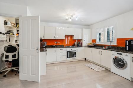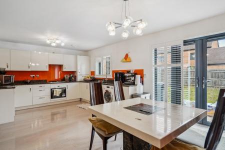 To the rear, you'll find the stunning open-plan kitchen/dining room, truly the heart of the home. Ideal for both everyday family life and entertaining, the kitchen boasts ample worktop space, generous storage solutions, and integrated appliances. French doors open out onto the garden, further enhancing the sense of space and flow.