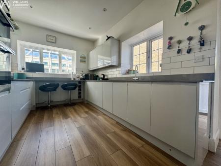 As you continue your journey, prepare to be impressed by the modern galley-style kitchen. This space is not only aesthetically pleasing but also highly functional, featuring ample workspace and access to a convenient utility area.