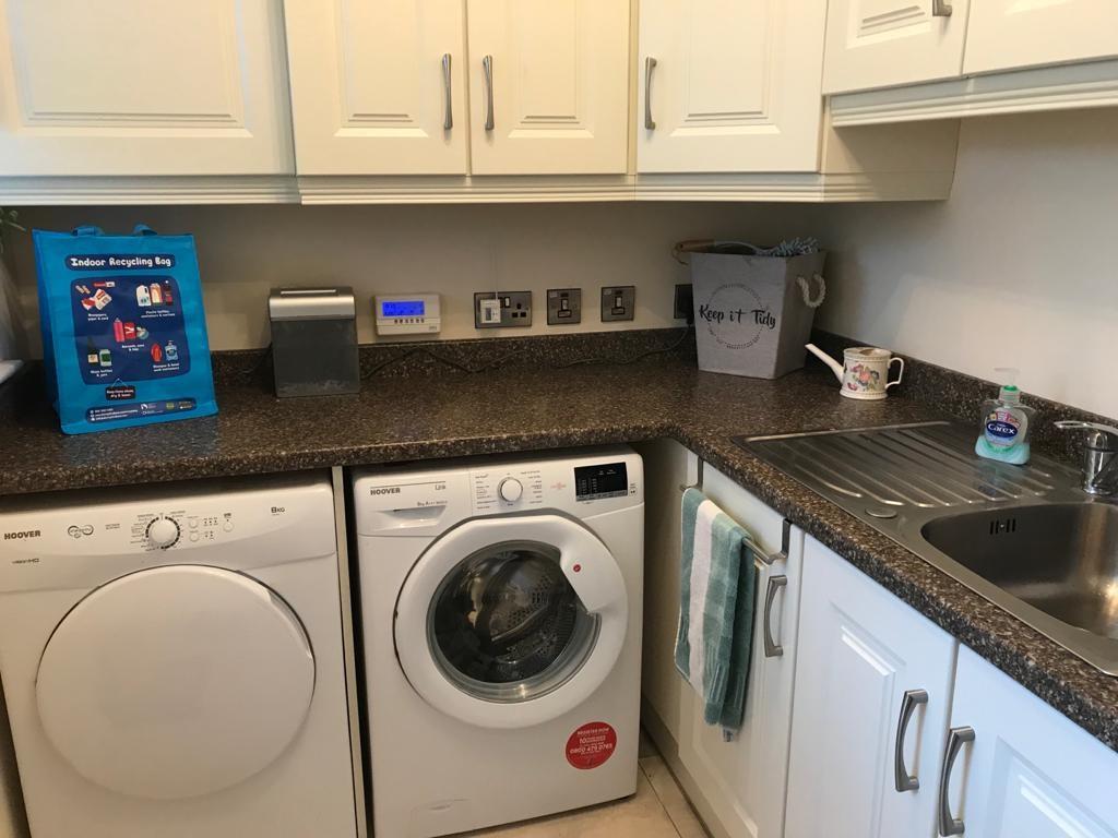 Having eye and low level units, single drainer stainless steel sink unit with mixer taps, plumbed for washing machine, space for tumble dryer.