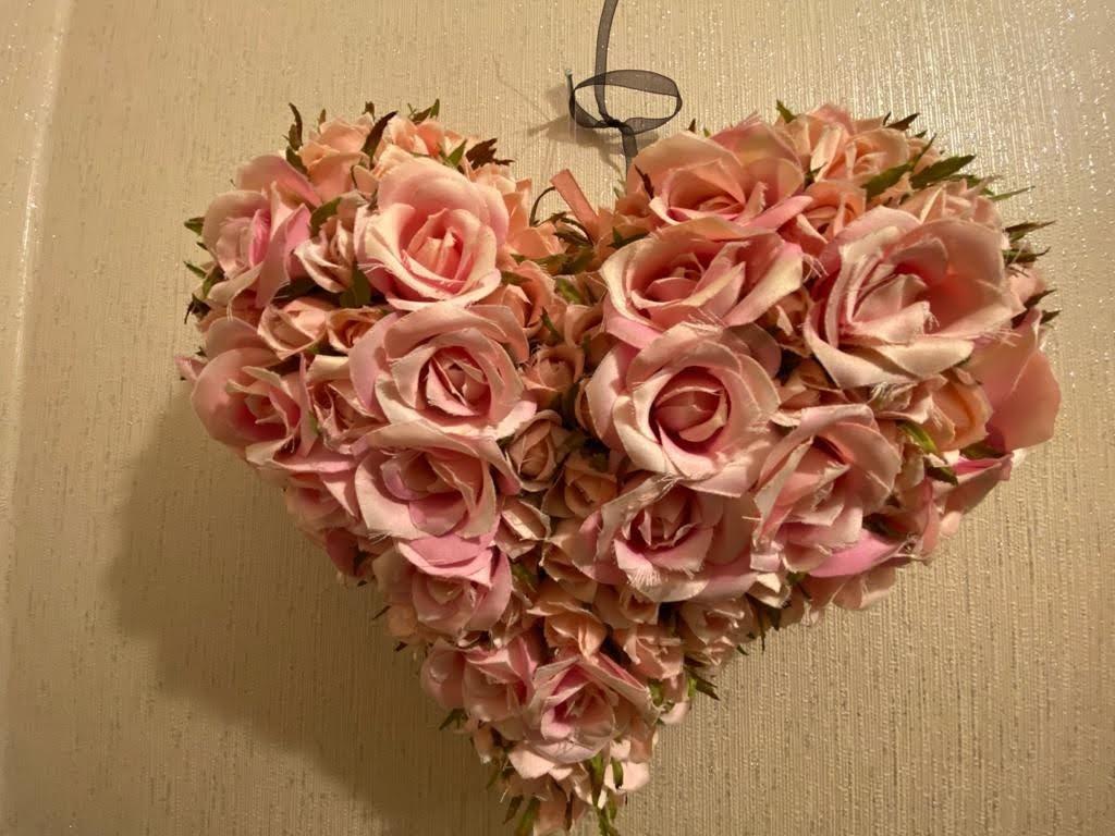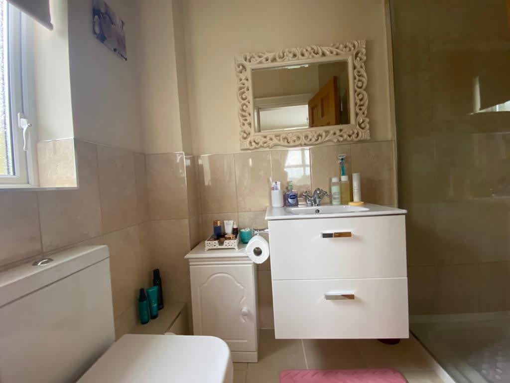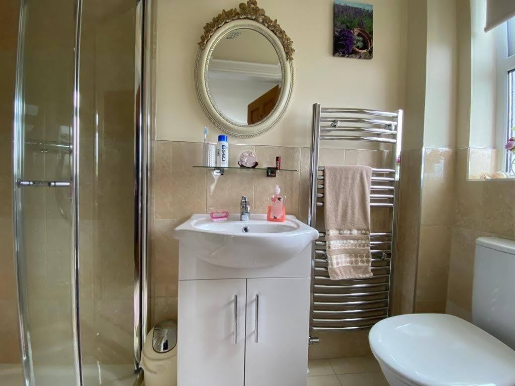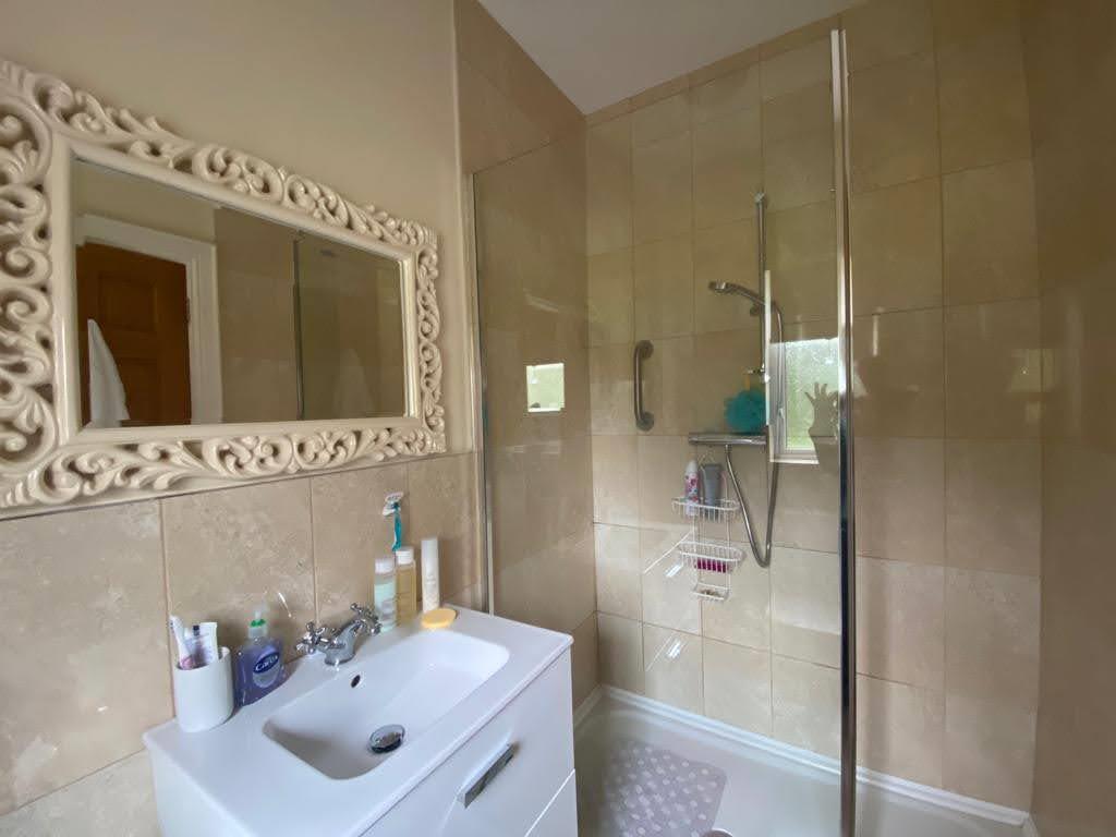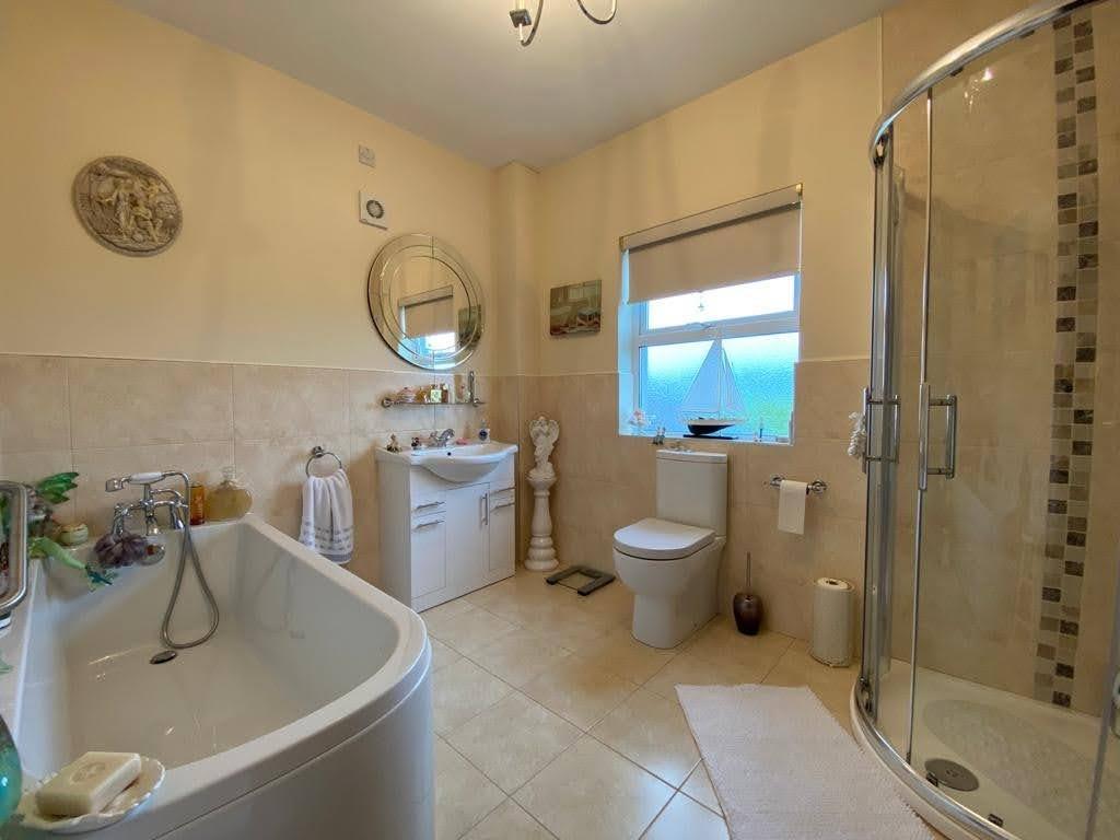 Comprising bath with shower fitting to taps, whb set in vanity unit, wc, fully tiled walk in electric shower, remaining walls 1/2 tiled, tiled floor.