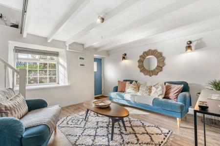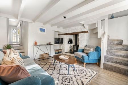 Window seat. UPVC double glazed window to front. Stairs off to first floor. Karndean flooring. Feature woodburning stove set on slate hearth in attractive fireplace surround with original clome oven and exposed slate to side. Open beamed ceiling. Steps to