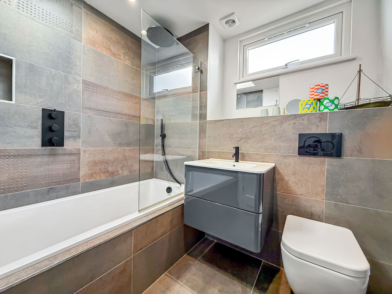 With high quality suite with beautiful tiled walls and flooring. Panelled bath with shower attachment, shower screen and rainfall shower head over. Wash hand basin with soft close drawers below and Geberit concealed cistern w.c. Extractor fan.