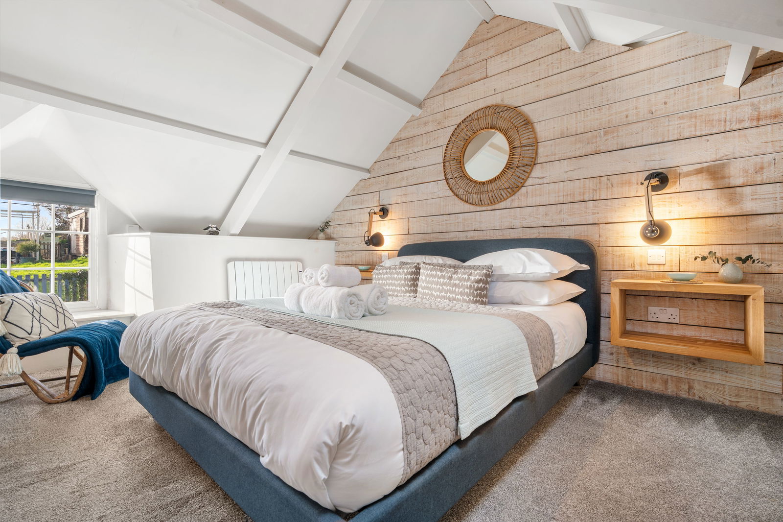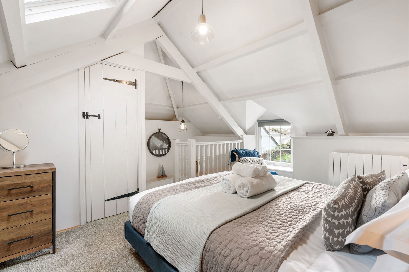 With slight restricted head room but a lovely beautiful open vaulted room with exposed timber beams. Dual aspect windows with UPVC double glazing to front and double glazed Velux window to rear. Attractive feature timber panelled wall. Electric heater. Large built in wardrobe with shelving and hanging space.