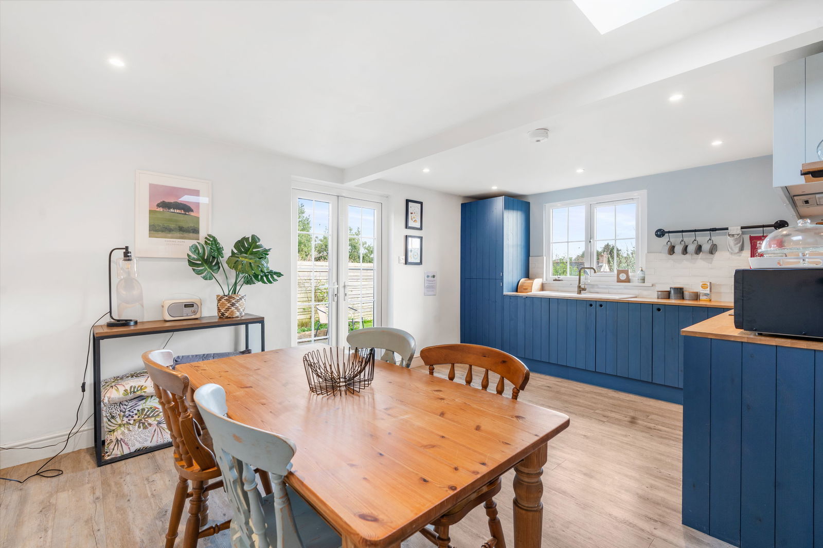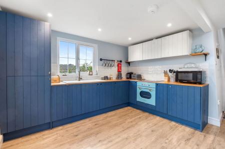 Karndean flooring. Fantastic fully fitted modern kitchen. Timber worktops. Single drainer sink with mixer tap over. High quality kitchen units. Built in electric oven. 4 ring ceramic hob. Fridge/freezer. Integral dishwasher and integral washing machine. Night storage heater. Lovely light dual aspect room with view to side over the lovely village church. Double glazed French doors onto rear garden (see later).