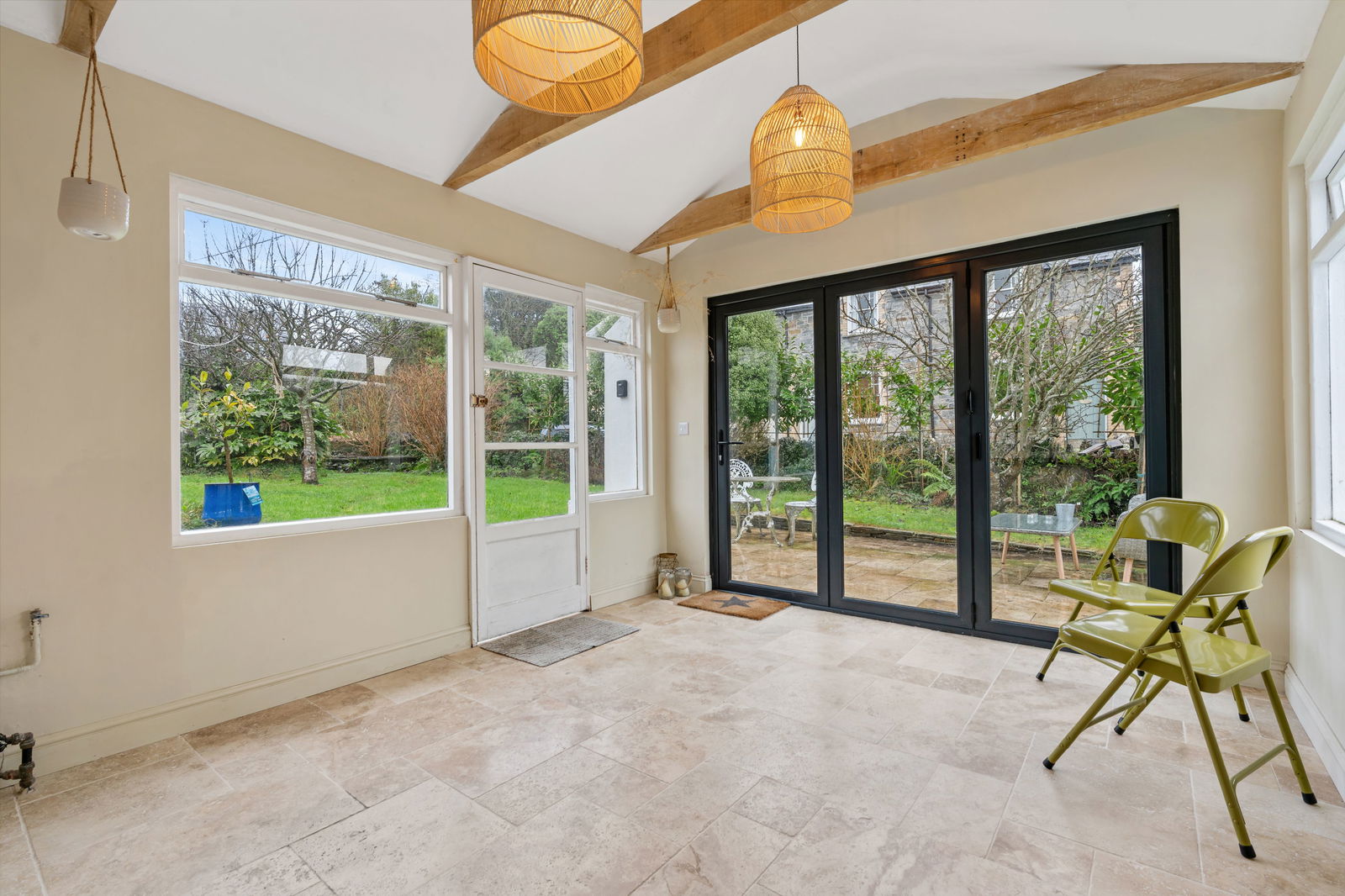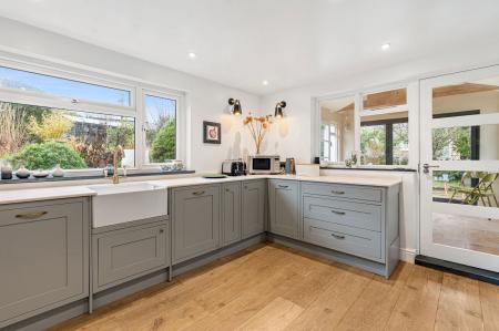 A lovely light triple aspect room with double glazed bi-fold doors leading onto patio. Further door to patio and windows to front and rear. Tiled flooring. Built in storage cupboard housing Worcester Combi boiler.