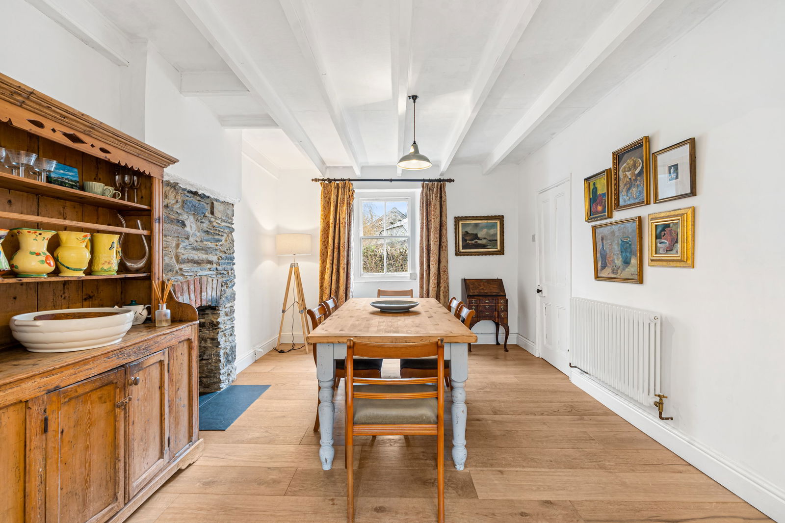 Sash window to front. Feature fireplace with woodburning stove, slate hearth, oak mantel over and storage cupboards to the side. Radiator. 2 understairs storage cupboards. Beamed ceiling. Door to kitchen.