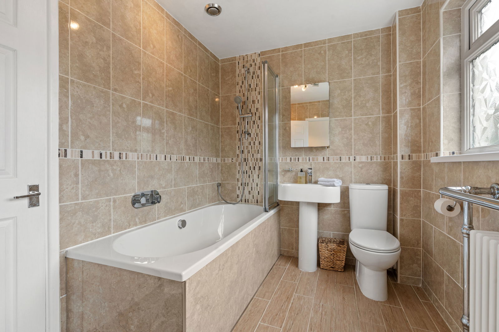A modern fitted tiled suite comprising panelled bath with shower over. Low level w.c. Wash hand basin. Radiator with towel rail. Opaque UPVC double glazed window to rear. Large airing cupboard.