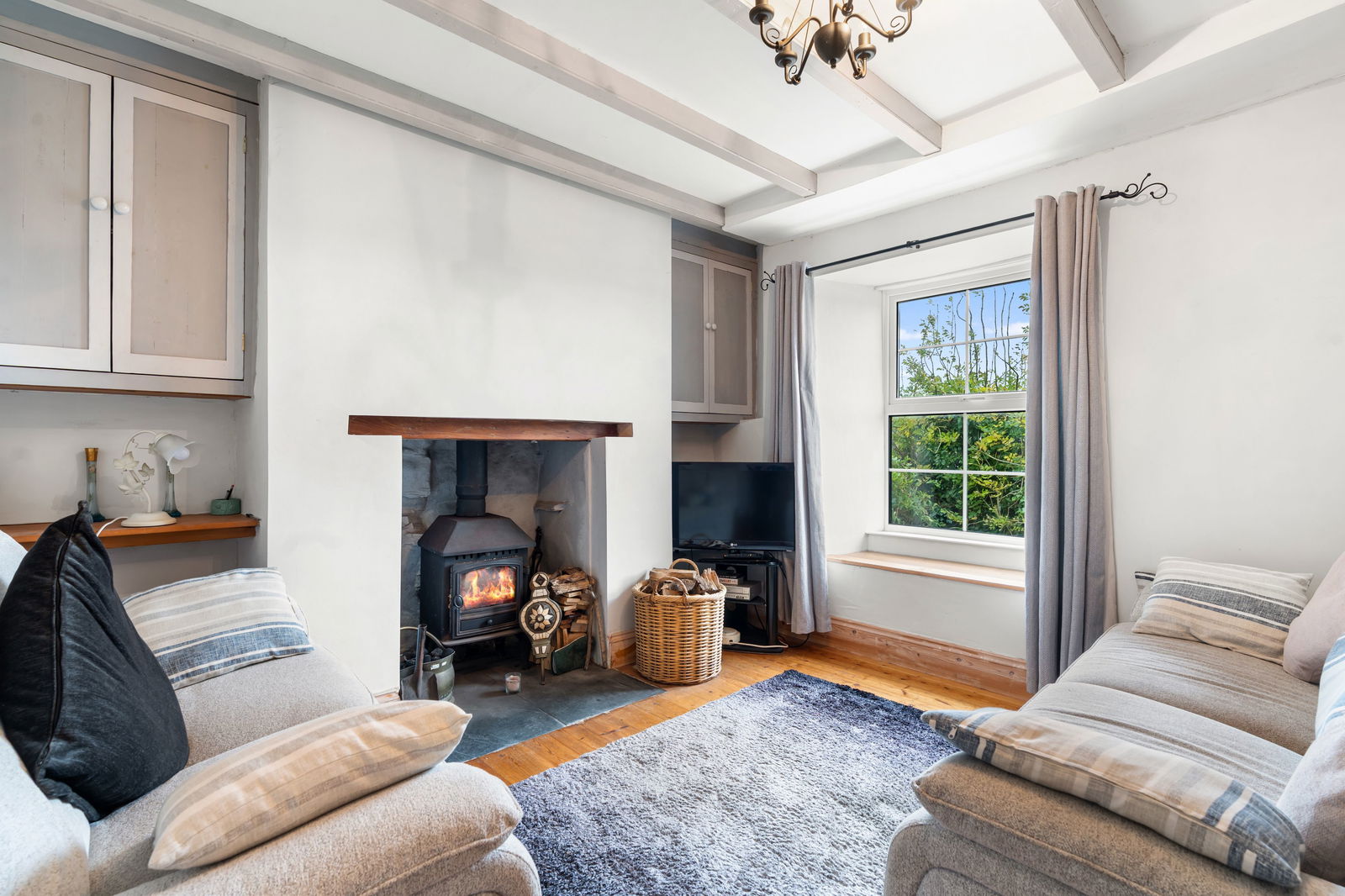 Double glazed window in UPVC frame to front, feature fireplace housing wood burner on slate hearth, radiator, beamed ceiling, stripped timber floors.