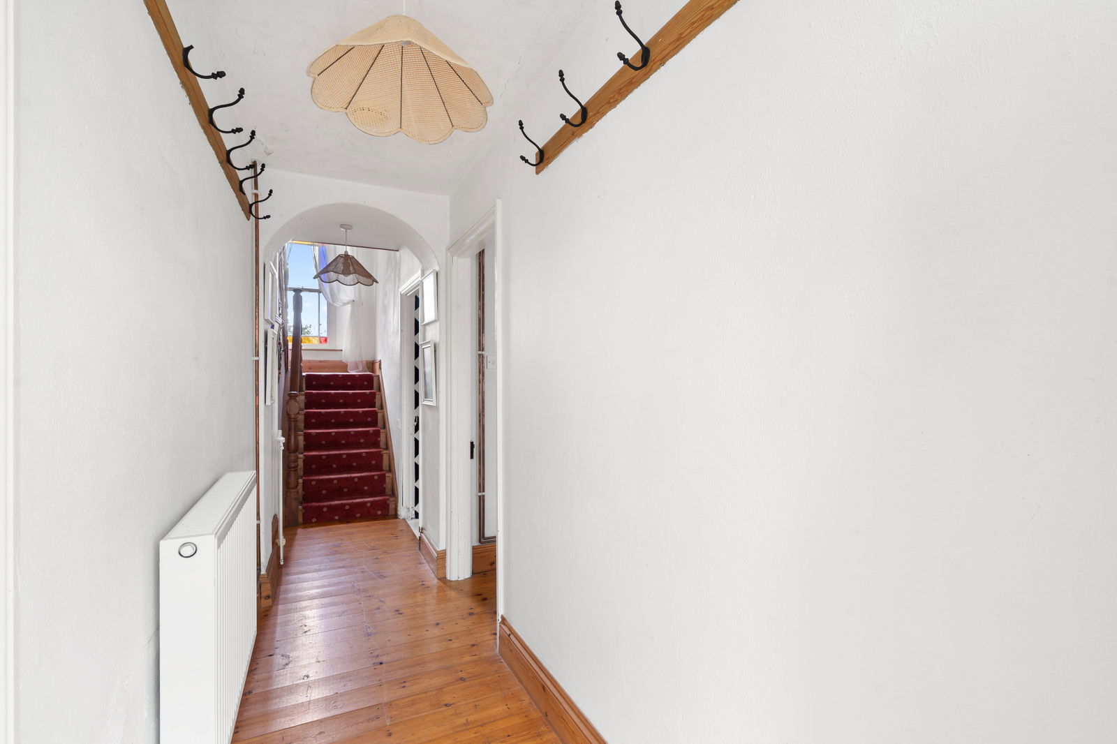Double glazed window in UPVC frame to side, double airing cupboard housing hot water cylinder with slatted shelving, stripped timber floors.