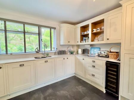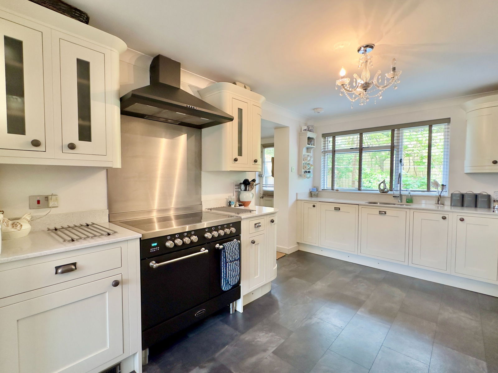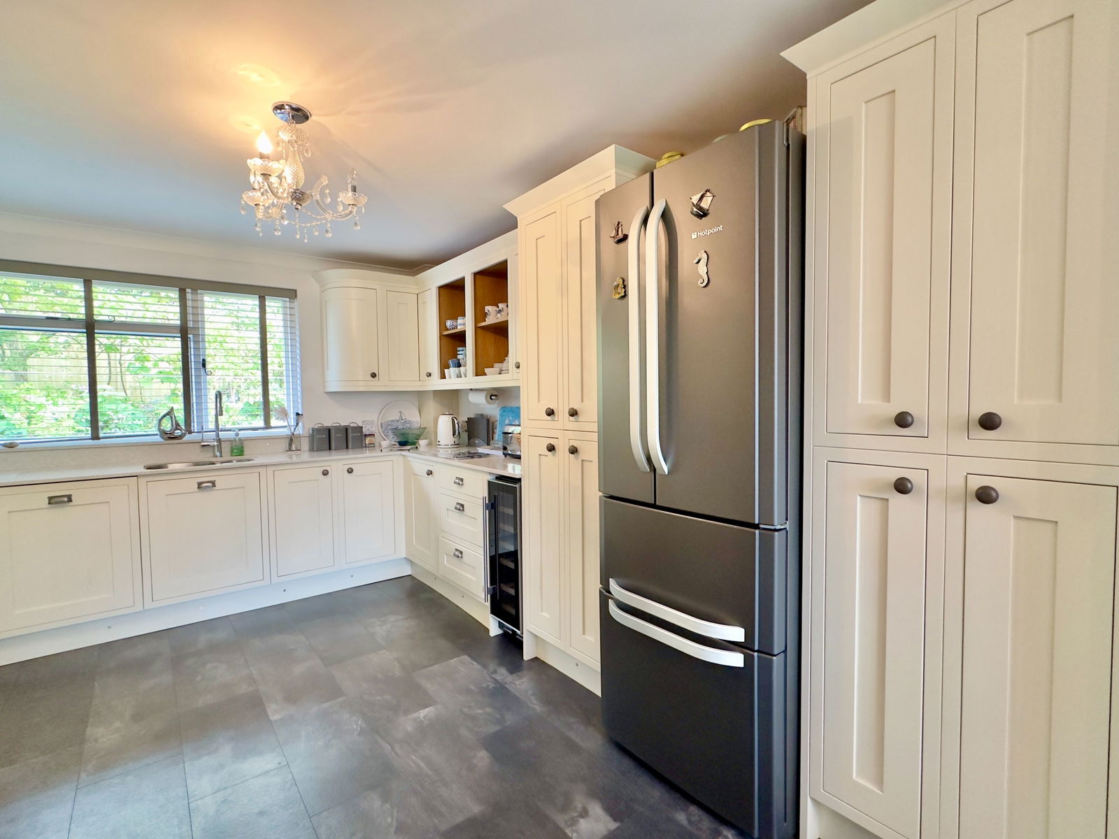 The front door opens into the central hallway which has slate effect flooring continuing into the kitchen/dining room. The kitchen has attractive stone-coloured units over a light quartz work top. There is a large range cooker and space for a fridge freezer, with integrated dish washer, wine cooler and built in lighting to the kitchen unit plinths. There is also a heater under the plinth which runs off of the central heating. From the kitchen is a utility room with plumbing for washing machine, space for a tumble dryer and a stable back door. From the utility room is a door to the fully tiled wet room, with walk-in shower, WC, hand basin, towel rail and mirror. There is a large, triple aspect living room with plantation style shutters, multi fuel inset fire and patio doors to the rear conservatory. Lastly, on the ground floor is a cosy snug which could be used as a fourth bedroom or study having views out onto the rear garden.